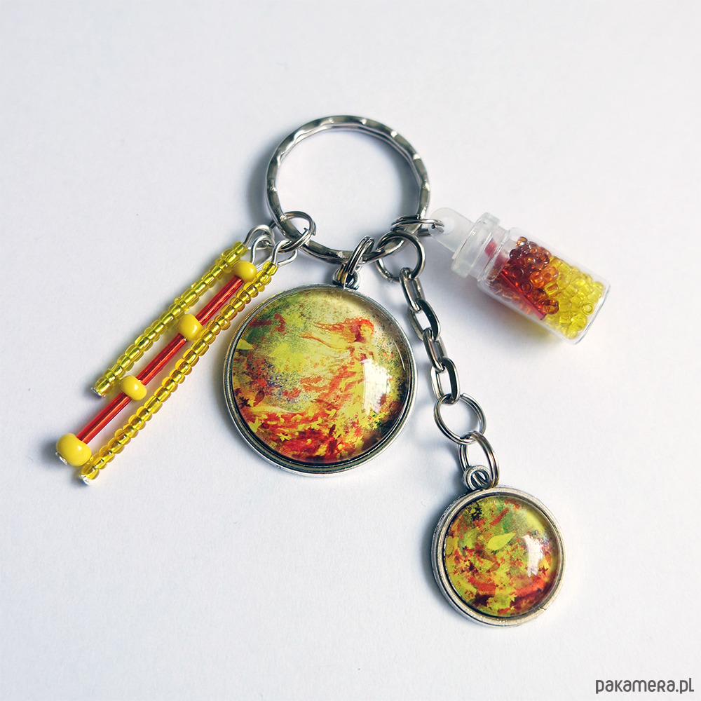 Niezwykły brelok z naszymi autorskimi grafikami, kompozycją z koralików oraz szklaną fiolką.