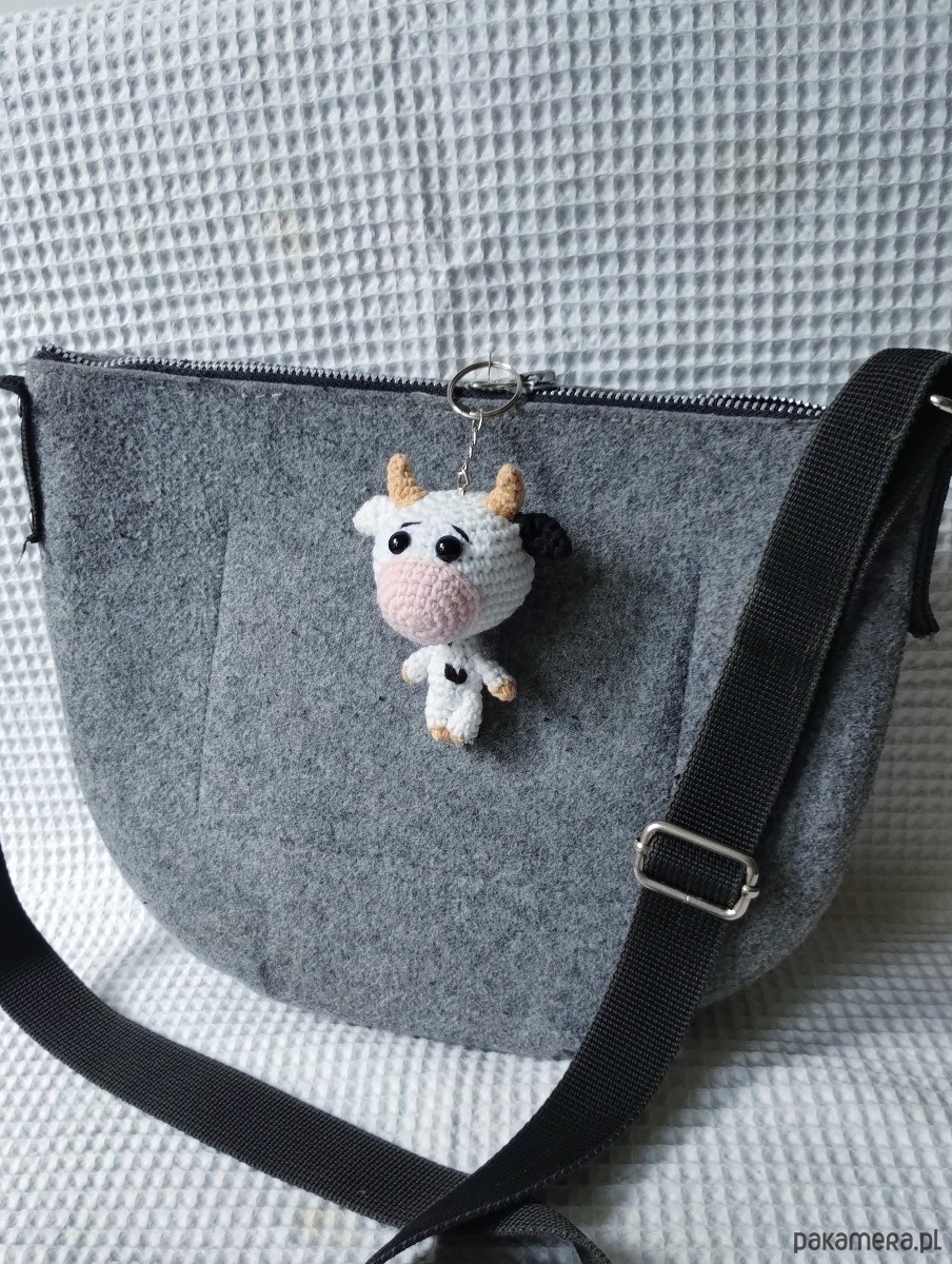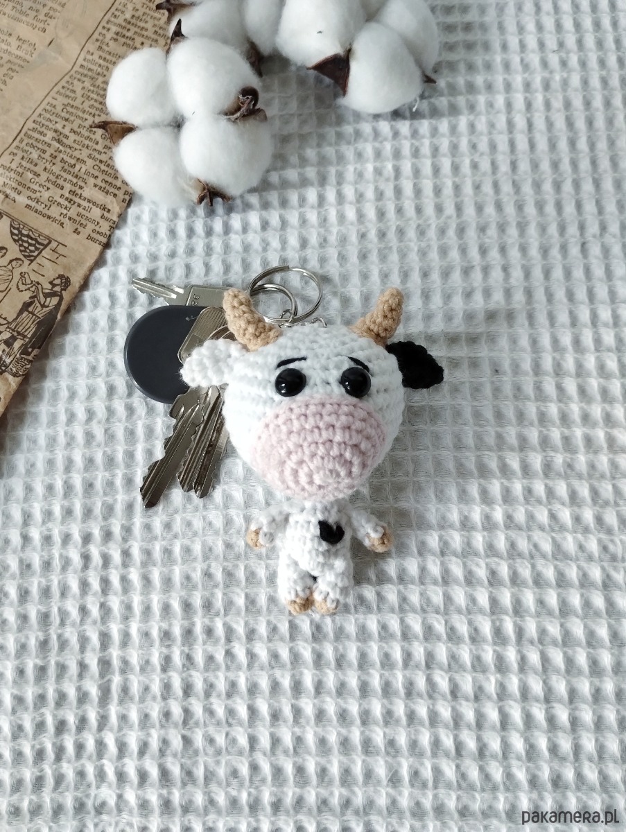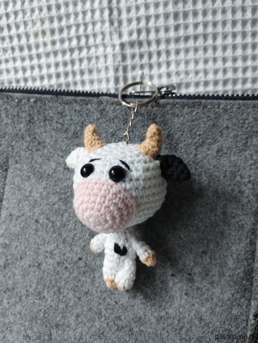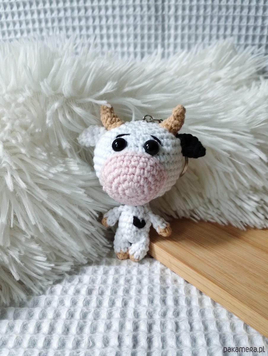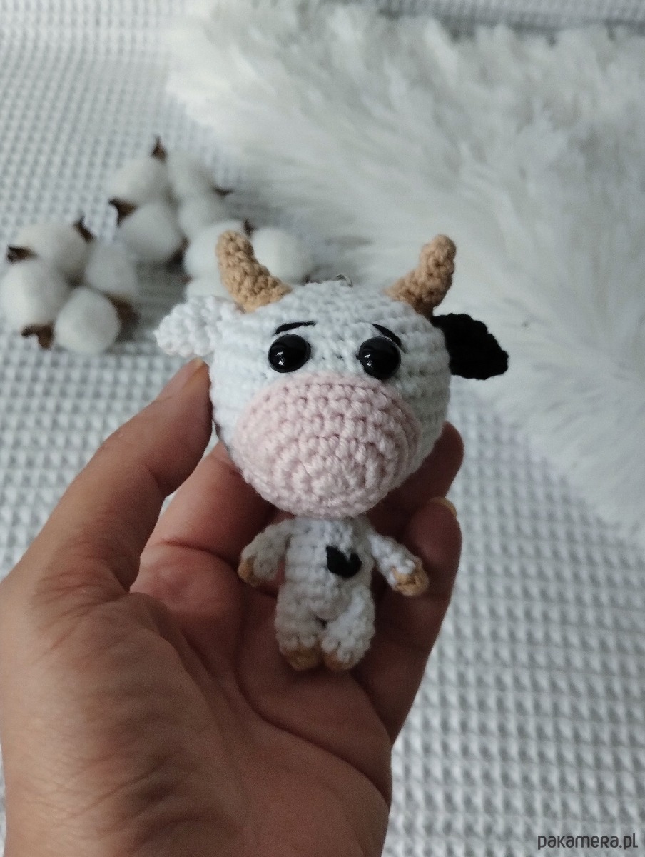A krówka mimo, że nie jest wielka, wszystko ma na swoim miejscu ;) różki, różową mordkę i łaciate ciałko. Jej wielkość to ok 10 cm + łańcuszek i kółeczko.