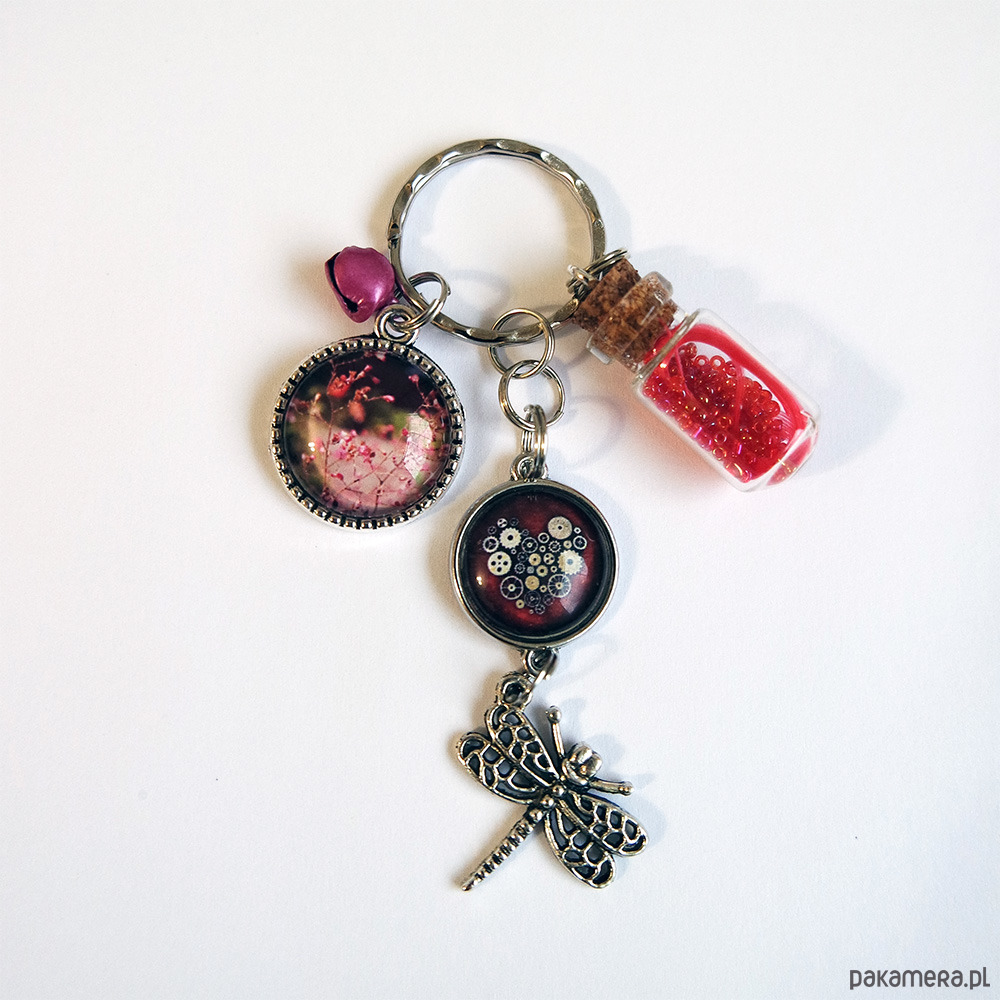 Niezwykły brelok z naszymi autorskimi grafikami, szklaną fiolką, mini dzwoneczkiem oraz zawieszką.