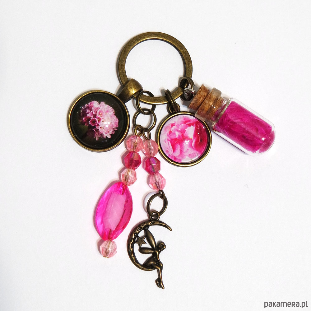 Niezwykły brelok z naszymi autorskimi grafikami, kompozycją z koralików, szklaną fiolką oraz zawieszką.