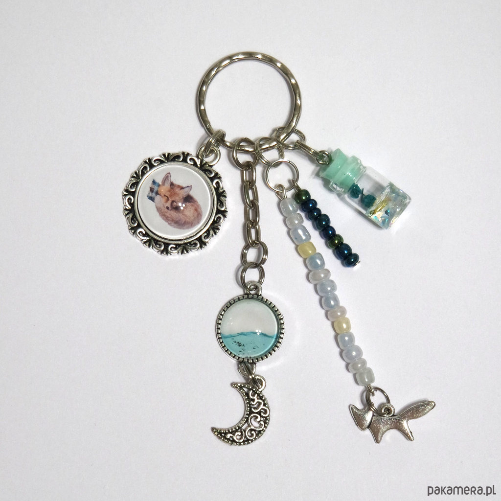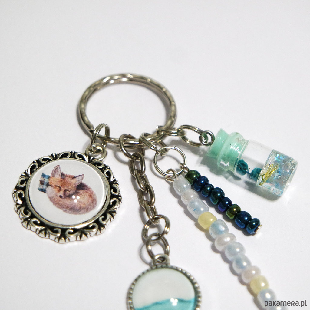 Niezwykły brelok z naszymi autorskimi grafikami, kompozycją z koralików, szklaną fiolką oraz zawieszkami.