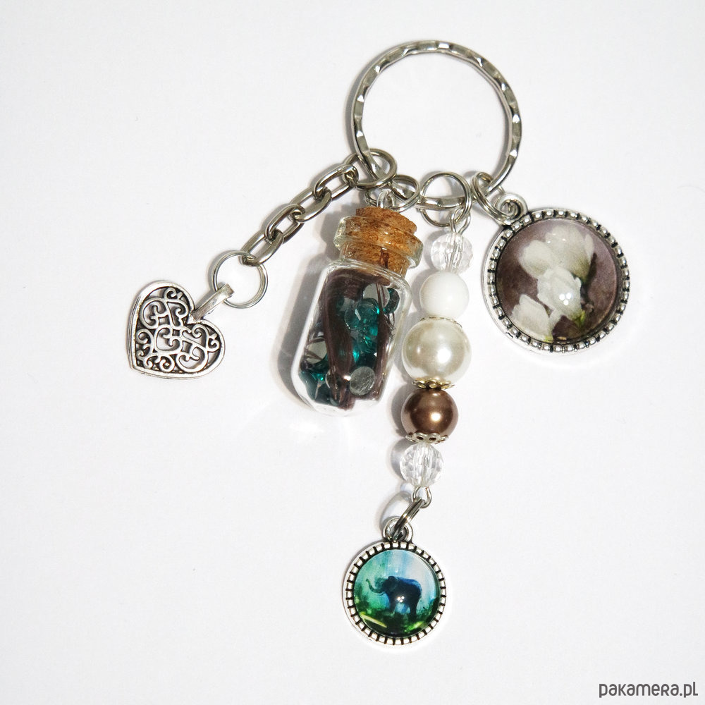 Niezwykły brelok z naszymi autorskimi grafikami, kompozycją z koralików, szklaną fiolką oraz zawieszką.