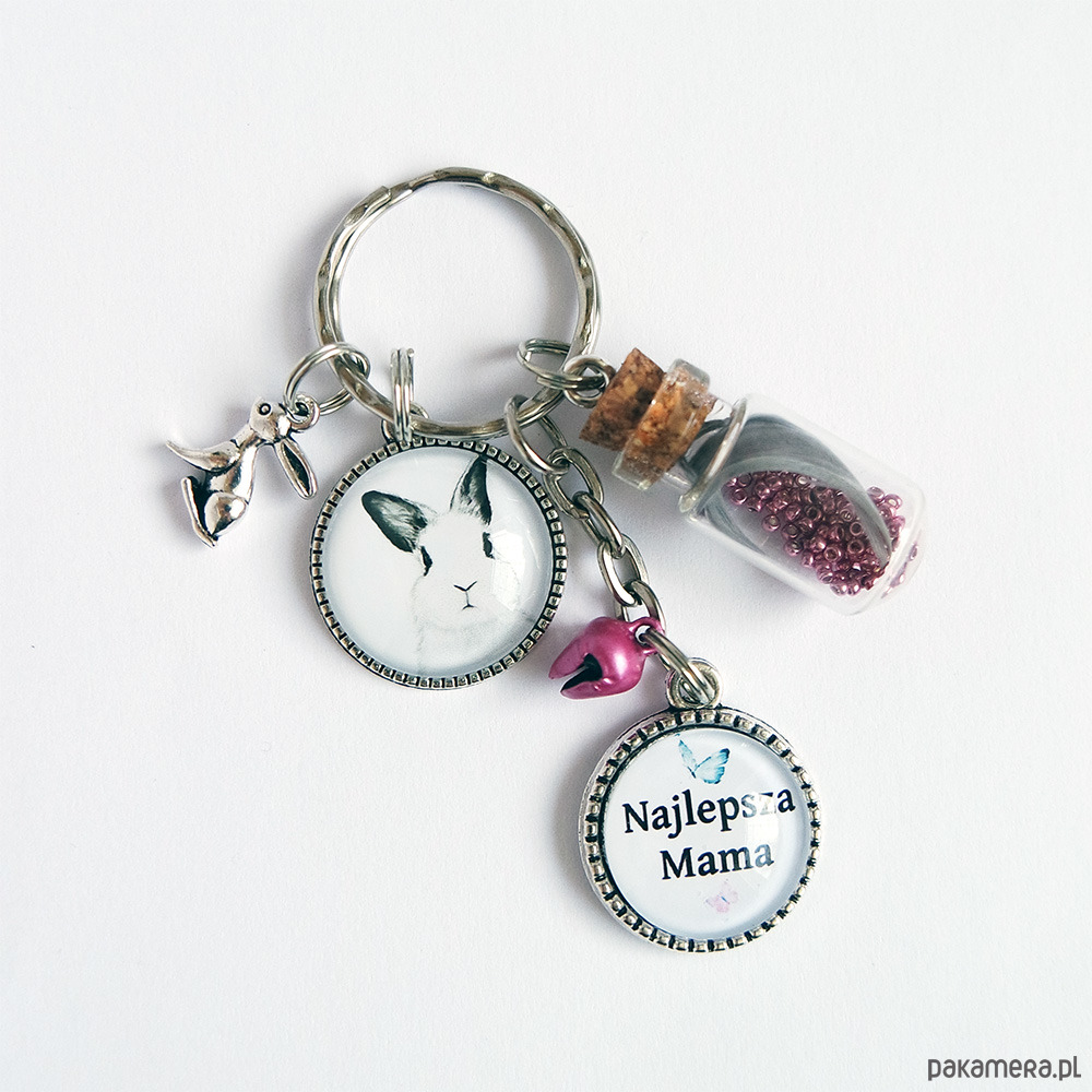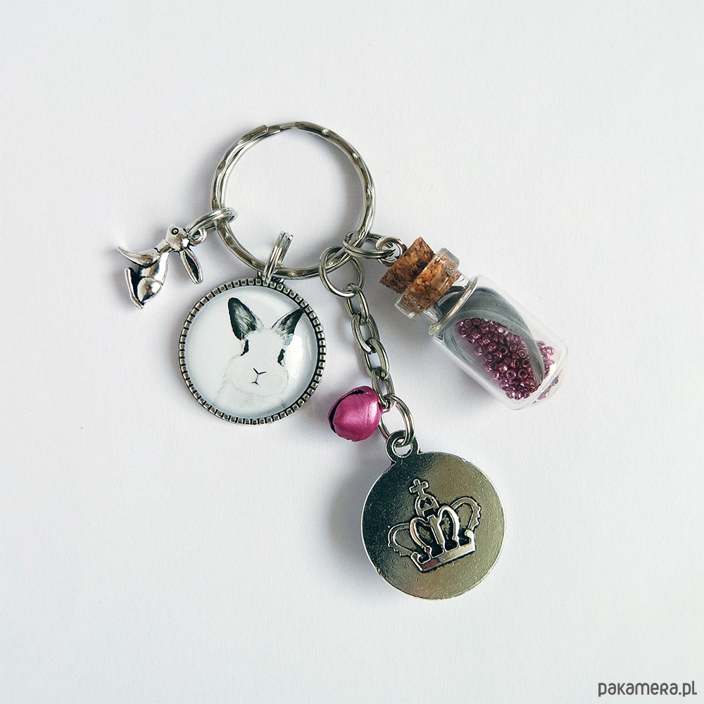 Niezwykły brelok z naszymi autorskimi grafikami, mini dzwoneczkiem, szklaną fiolką oraz zawieszką.