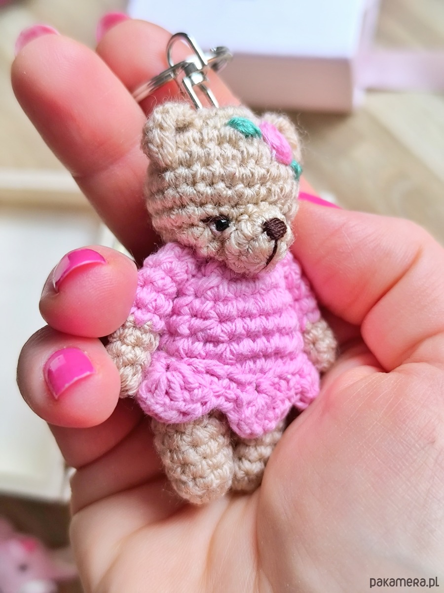 Będzie to też nietuzinkowa dekoracja albo element do zabawy. Miś mierzy ok 7 cm, elementy metalowe to ok 3 cm. Miś wykonany jest na szydełku z niemechacącej się włóczki akrylowej, ubranko to włóczka bawełniana. Jego główkę zdobi mała różowa haftowana róża wraz z miętowymi listkami.