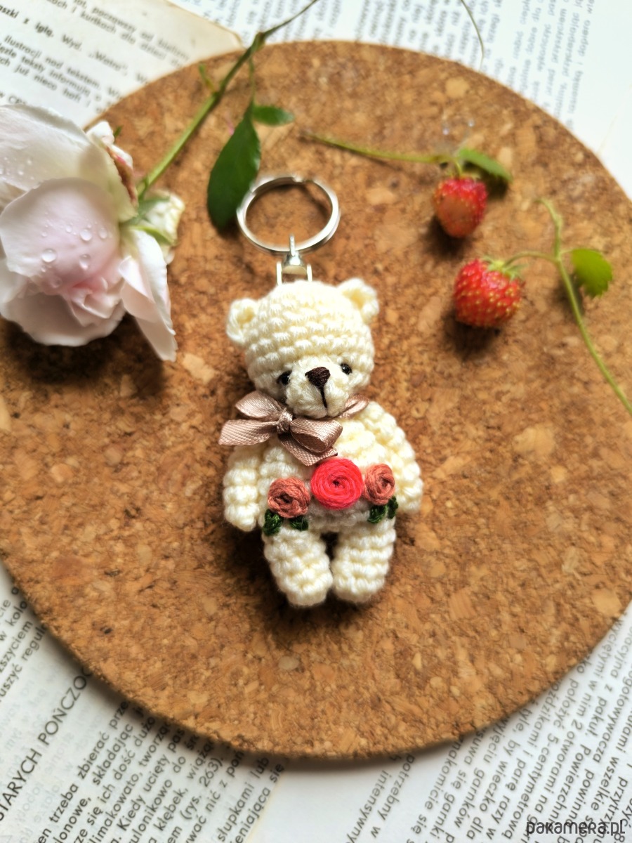 Vanilla to mały miś pod postacią breloczka. Mierzy ok. 6 cm plus elementy metalowe. Ta urocza (i praktyczna!) ozdoba, została ręcznie wykonana na szydełku.