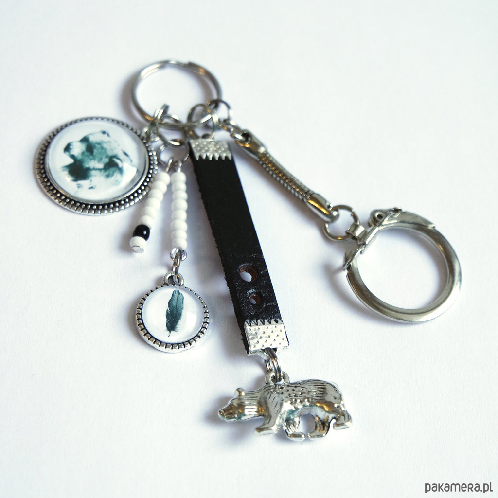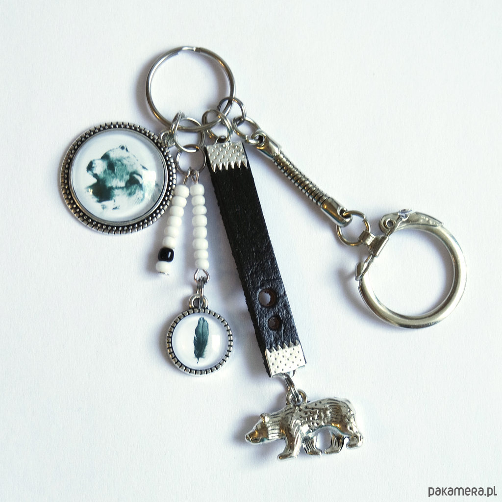 Breloczek - Niedźwiedź, piórko, rzemień