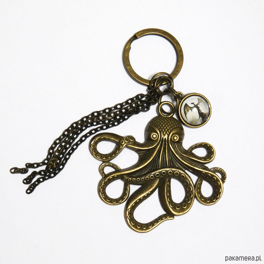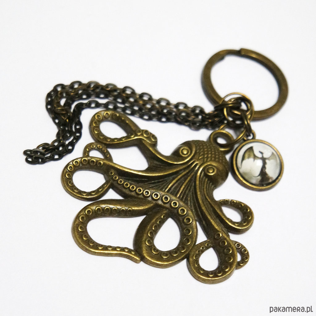 Niezwykły brelok z zawieszką metalową w kształcie ośmiornicy oraz zawieszką z naszą autorską grafiką pod szkiełkiem.