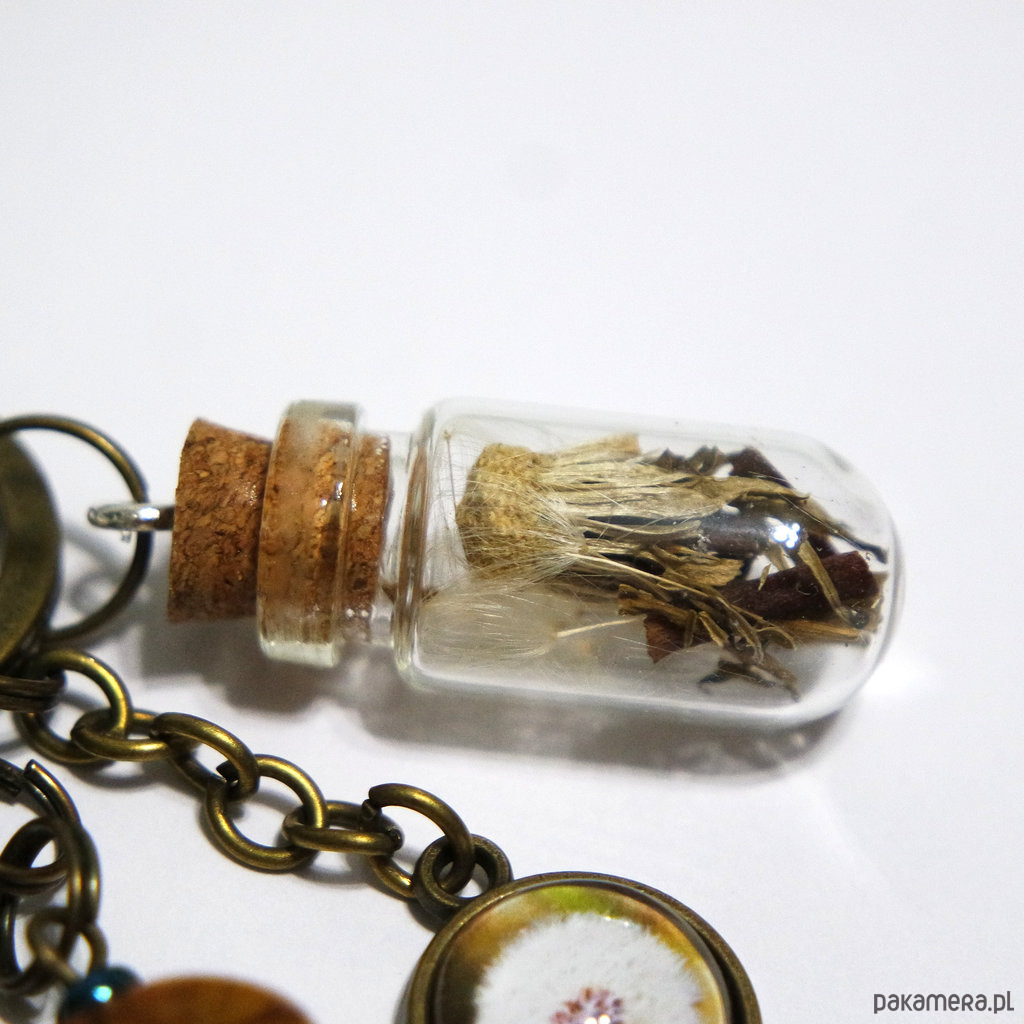Niezwykły brelok z naszymi autorskimi grafikami, kompozycją z koralików, szklaną fiolką oraz zawieszką.