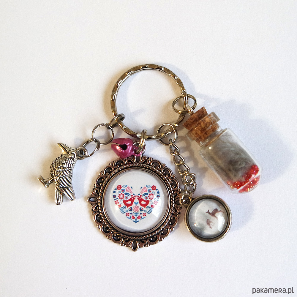 Niezwykły brelok z naszymi autorskimi grafikami, szklaną fiolką, mini dzwoneczkiem oraz zawieszką.