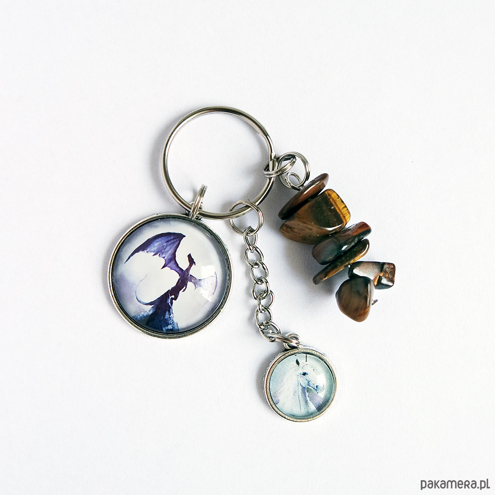 Niezwykły brelok z naszymi autorskimi grafikami oraz kompozycją z kwarcu tygrysie oko.