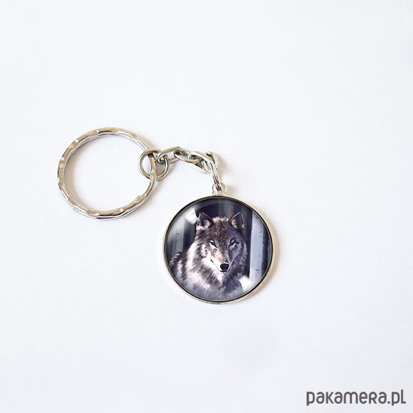 Grafika ukryta w prostym breloczku, pod osłoną przeźroczystego półokrągłego szkiełka.