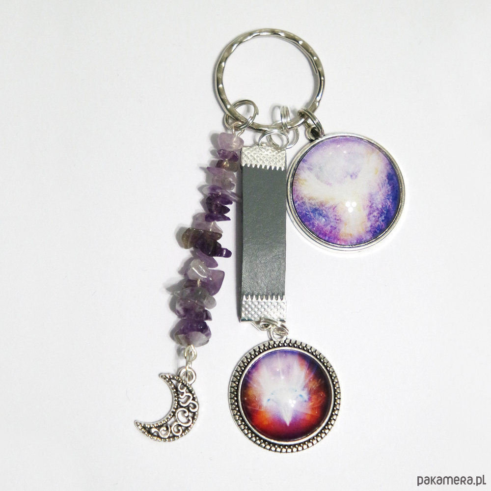 Niezwykły brelok z naszymi autorskimi grafikami - autorska kolekcja obrazów energetycznych EnergyShape, kompozycją z ametystu oraz skórzanym rzemieniem z zawieszką.