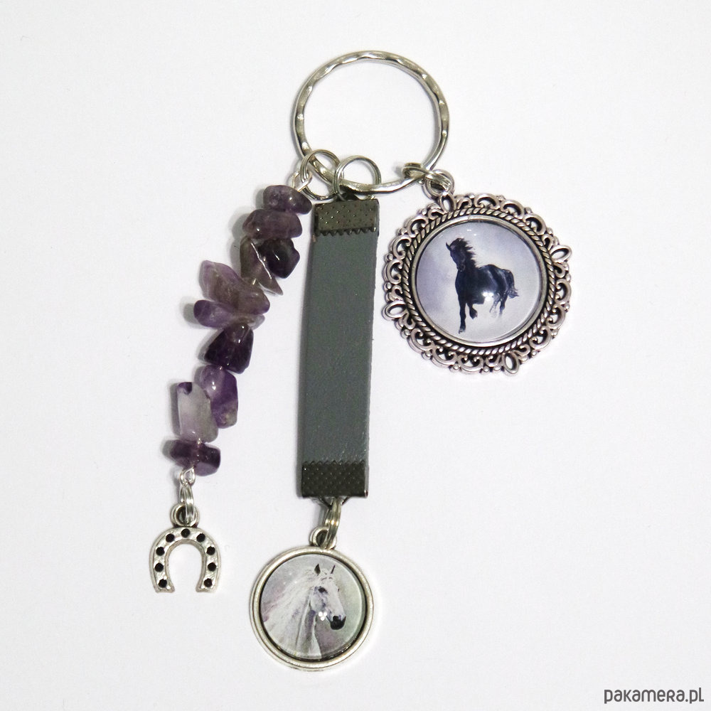 Niezwykły brelok z naszymi autorskimi grafikami, kompozycją z ametystu oraz skórzanym rzemieniem z zawieszką.