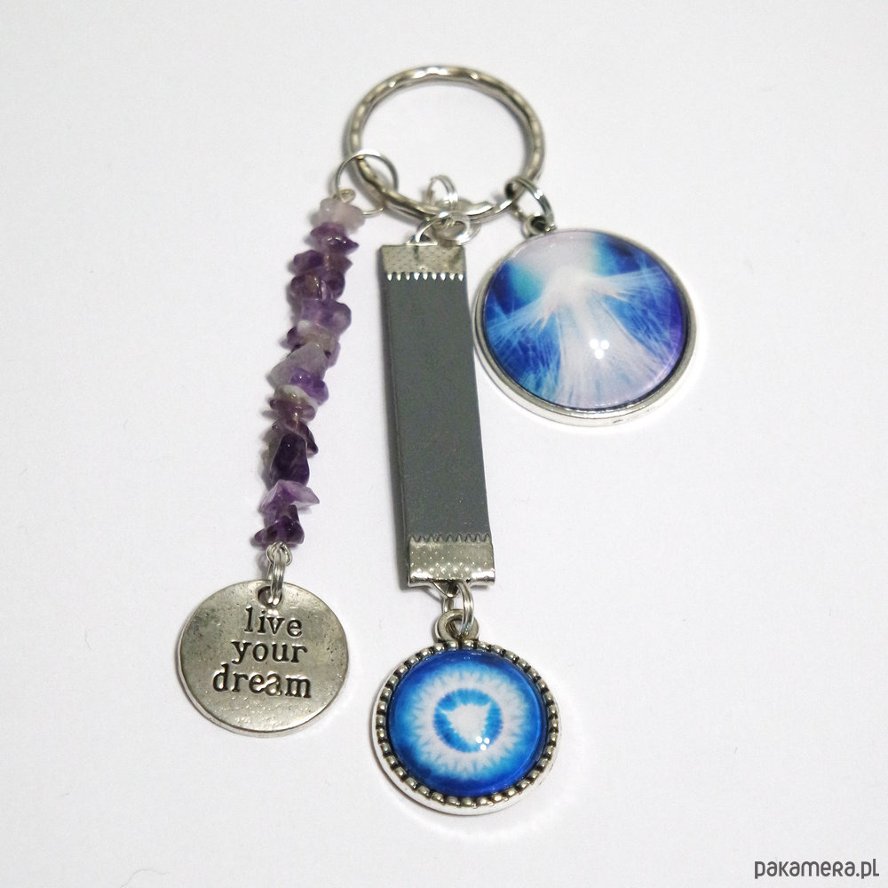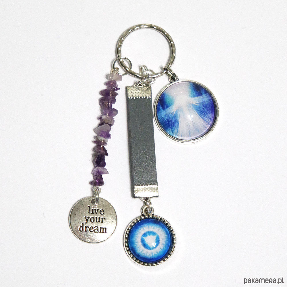Niezwykły brelok z naszymi autorskimi grafikami - autorska kolekcja obrazów energetycznych EnergyShape, kompozycją z ametystu oraz skórzanym rzemieniem z zawieszką.