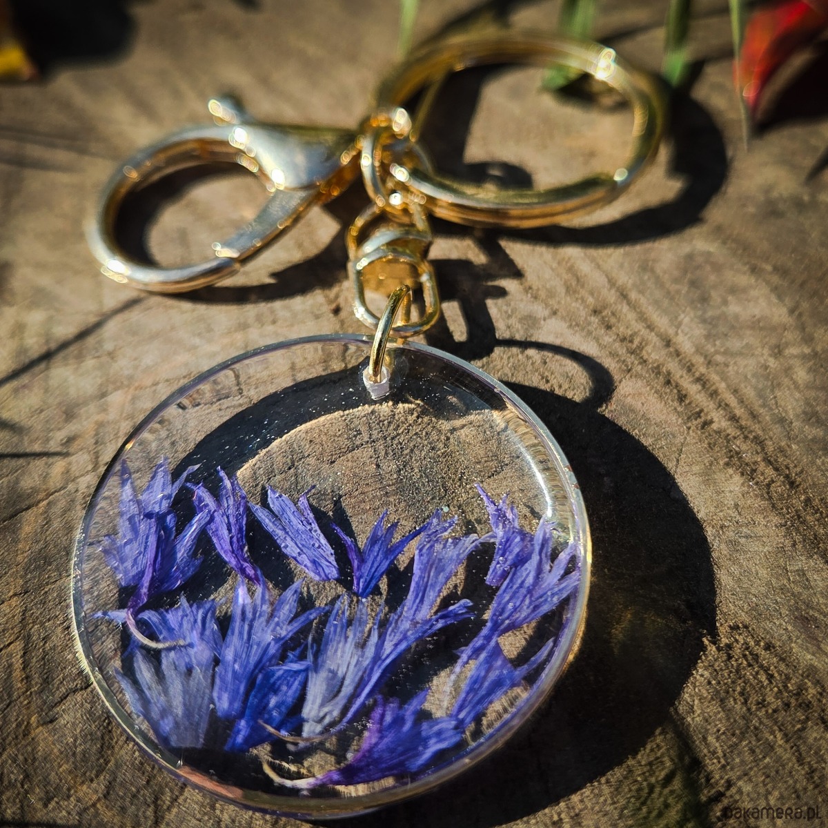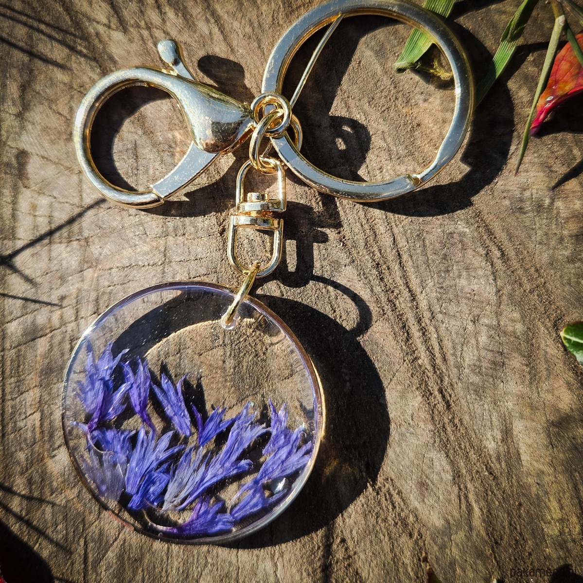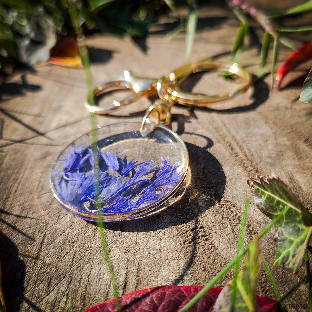Breloczek z chabrami zatopionymi w żywicy epoksydowej. Długość breloka - 10 cm.