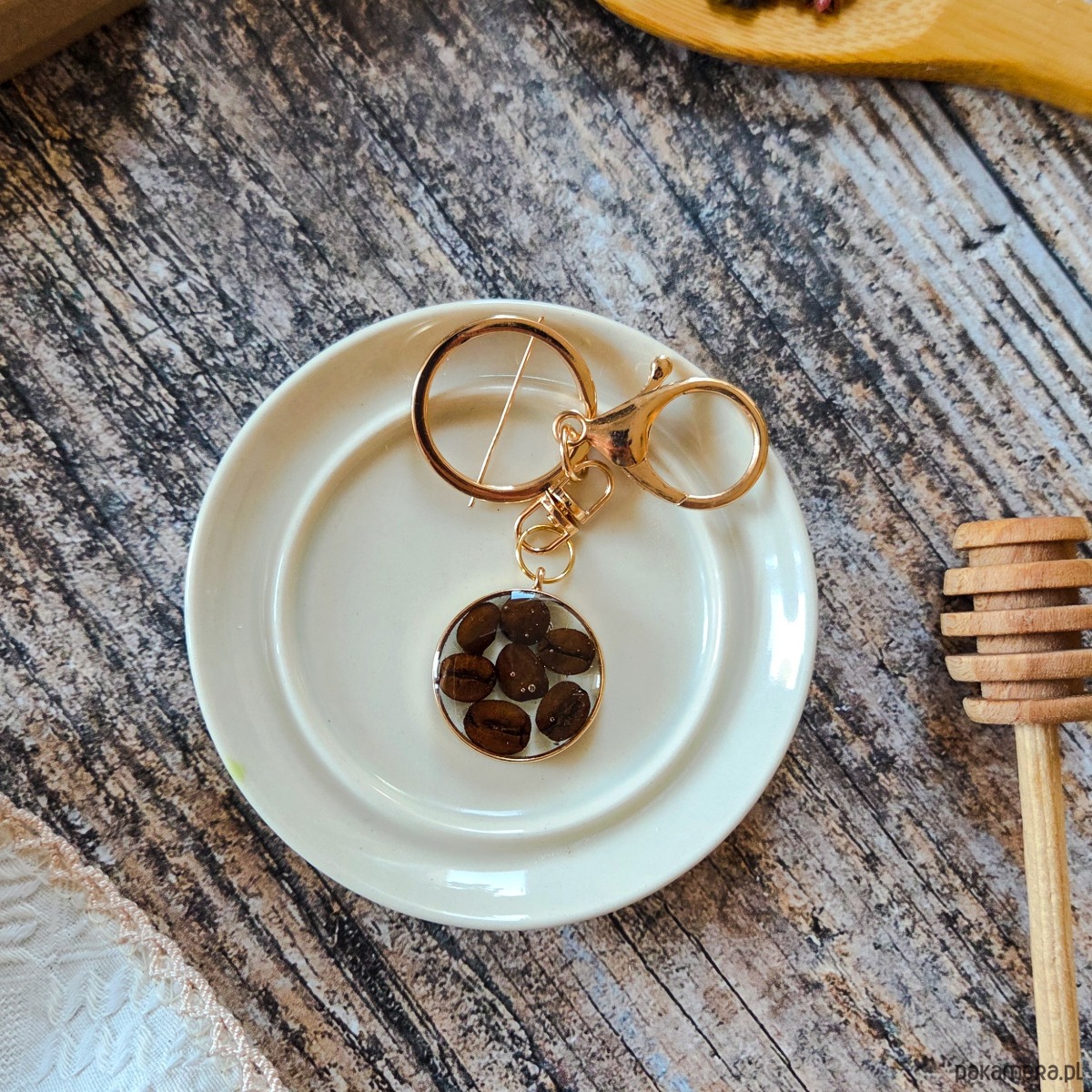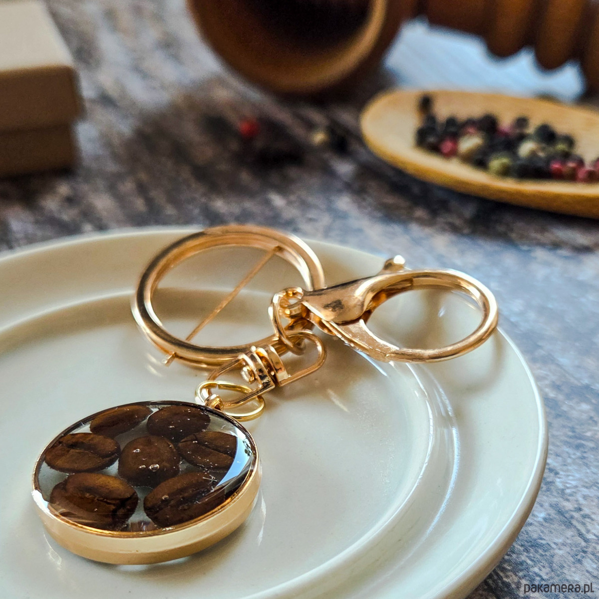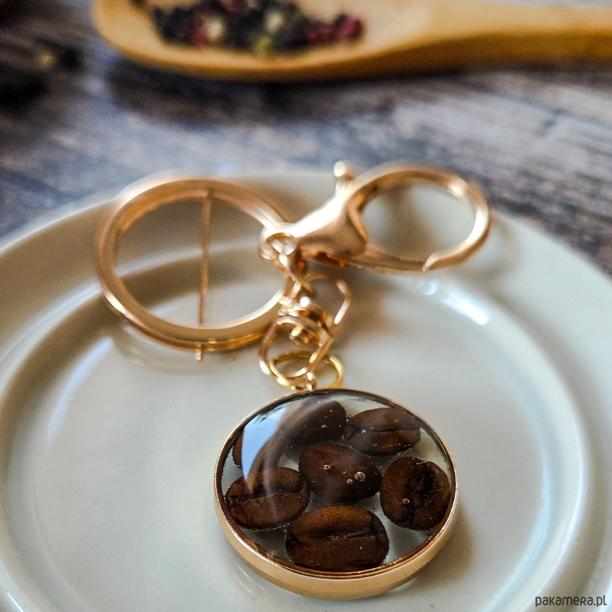 Breloczek z kawą zatopioną w żywicy epoksydowej.