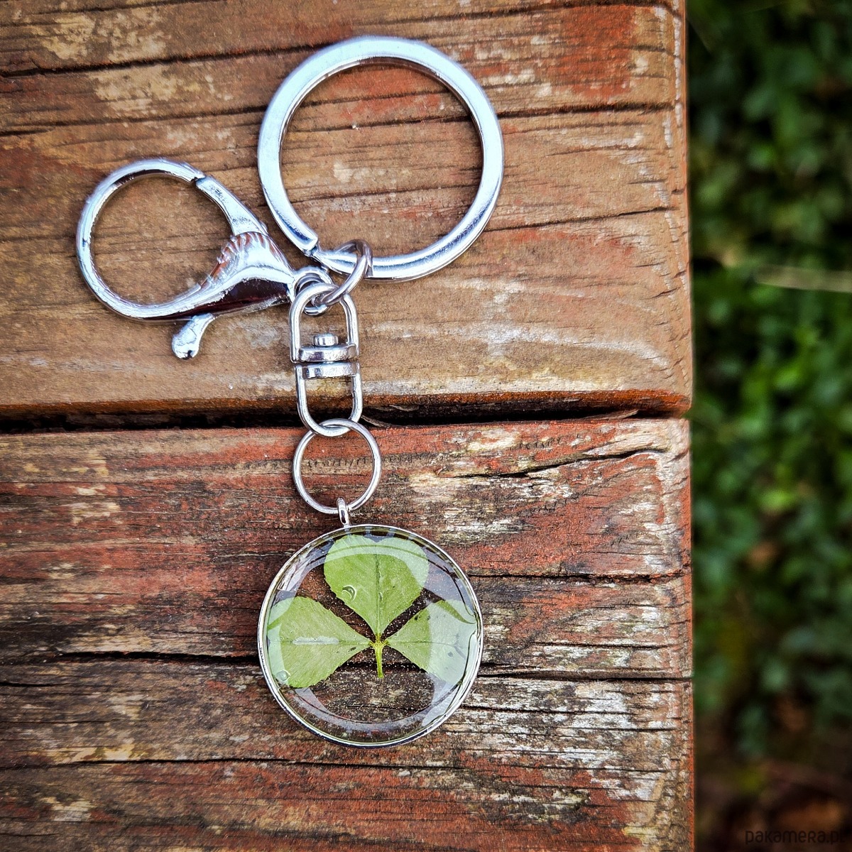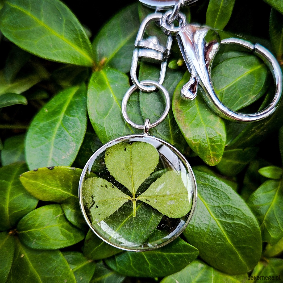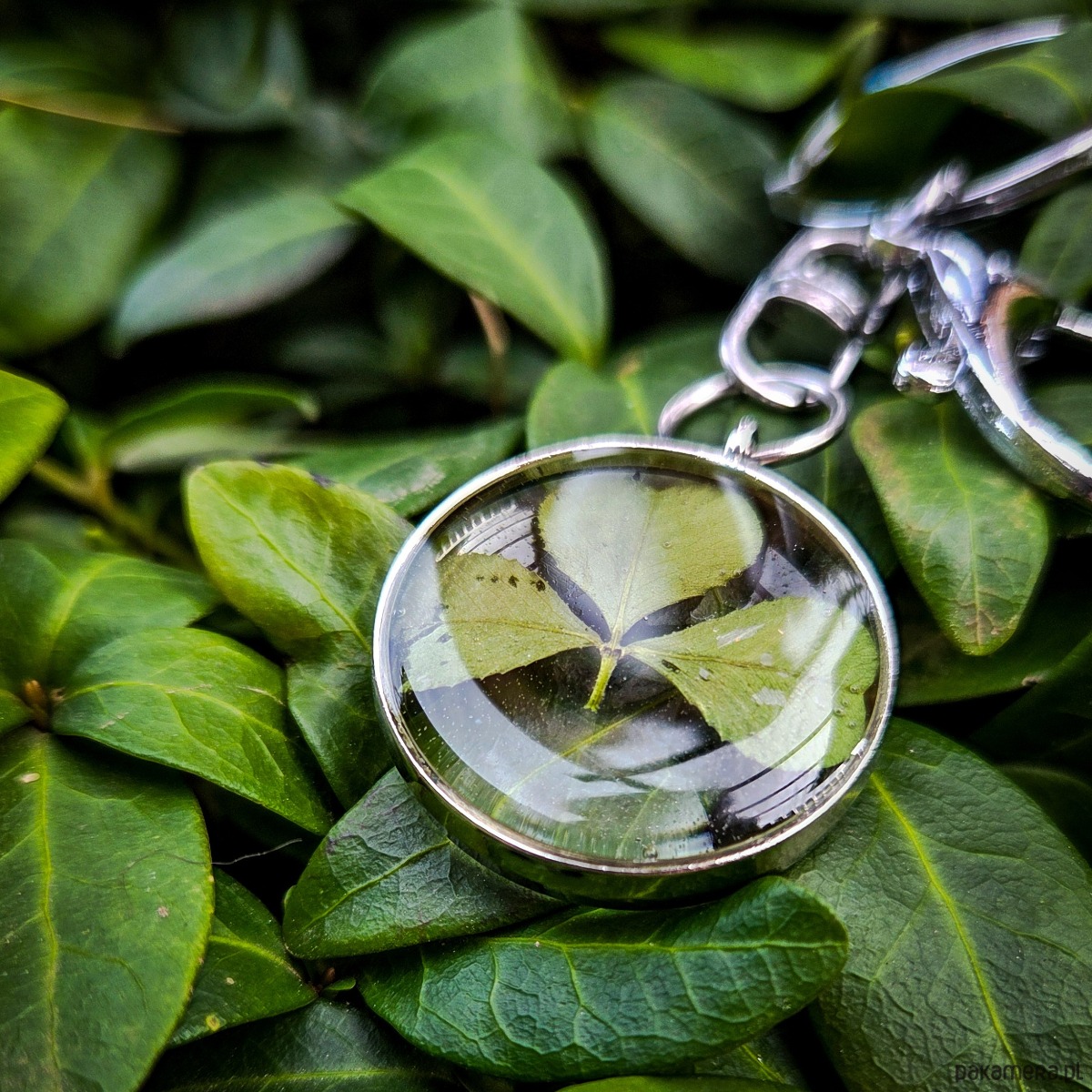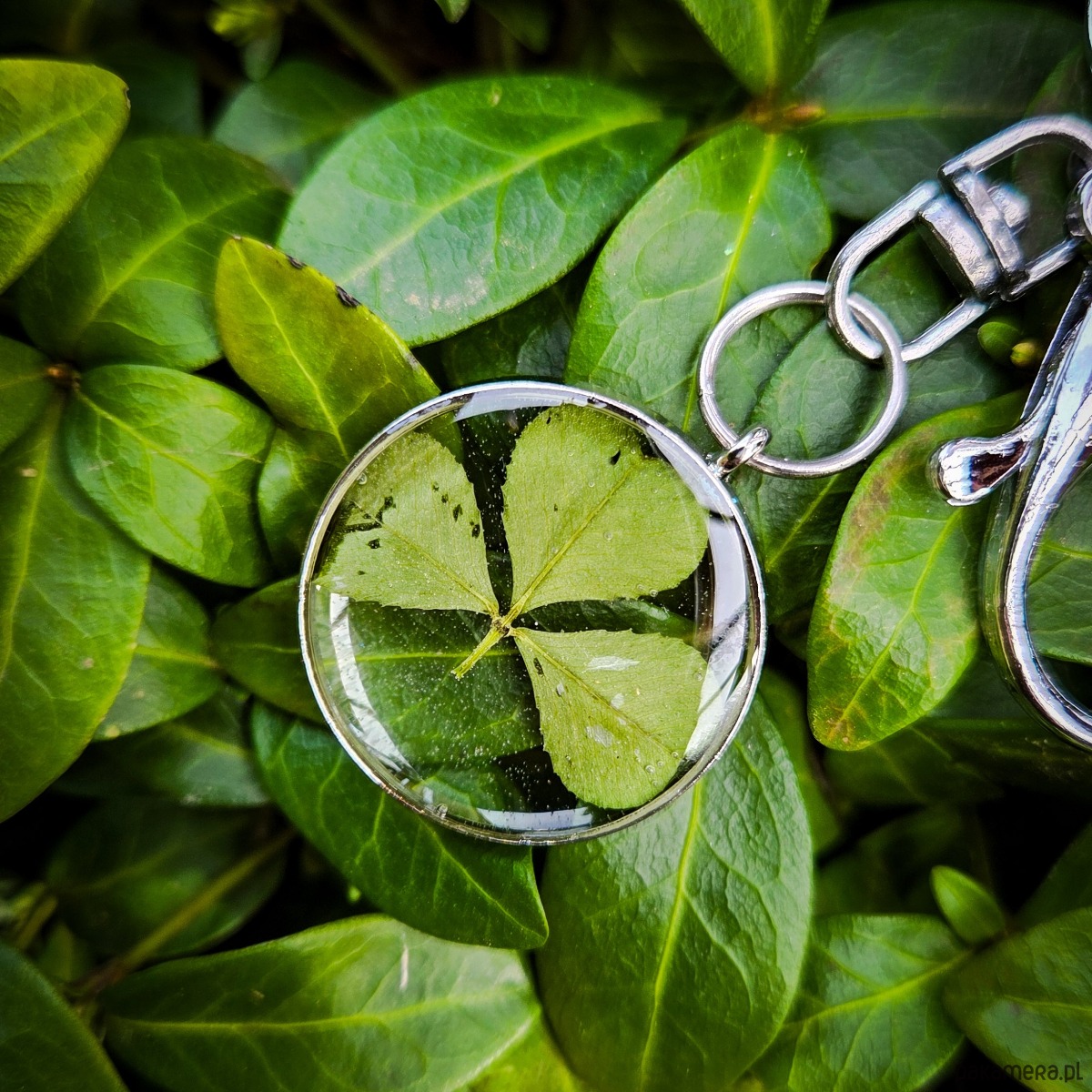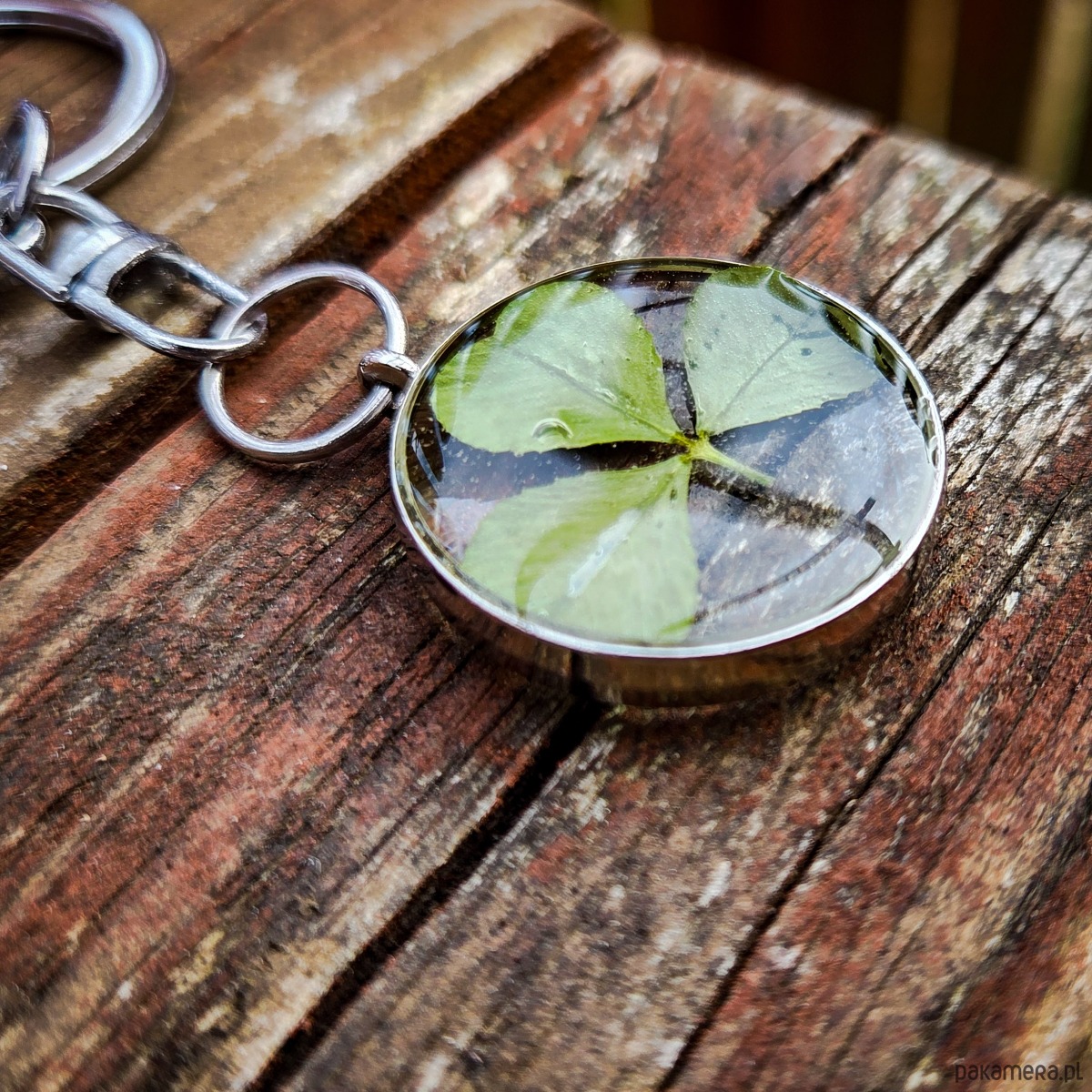 Breloczek z koniczyną zatopioną w żywicy epoksydowej.