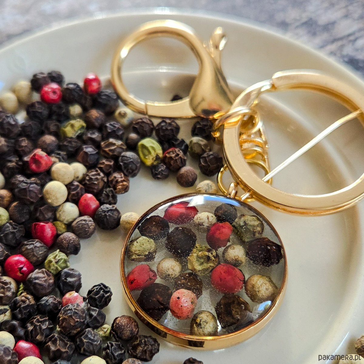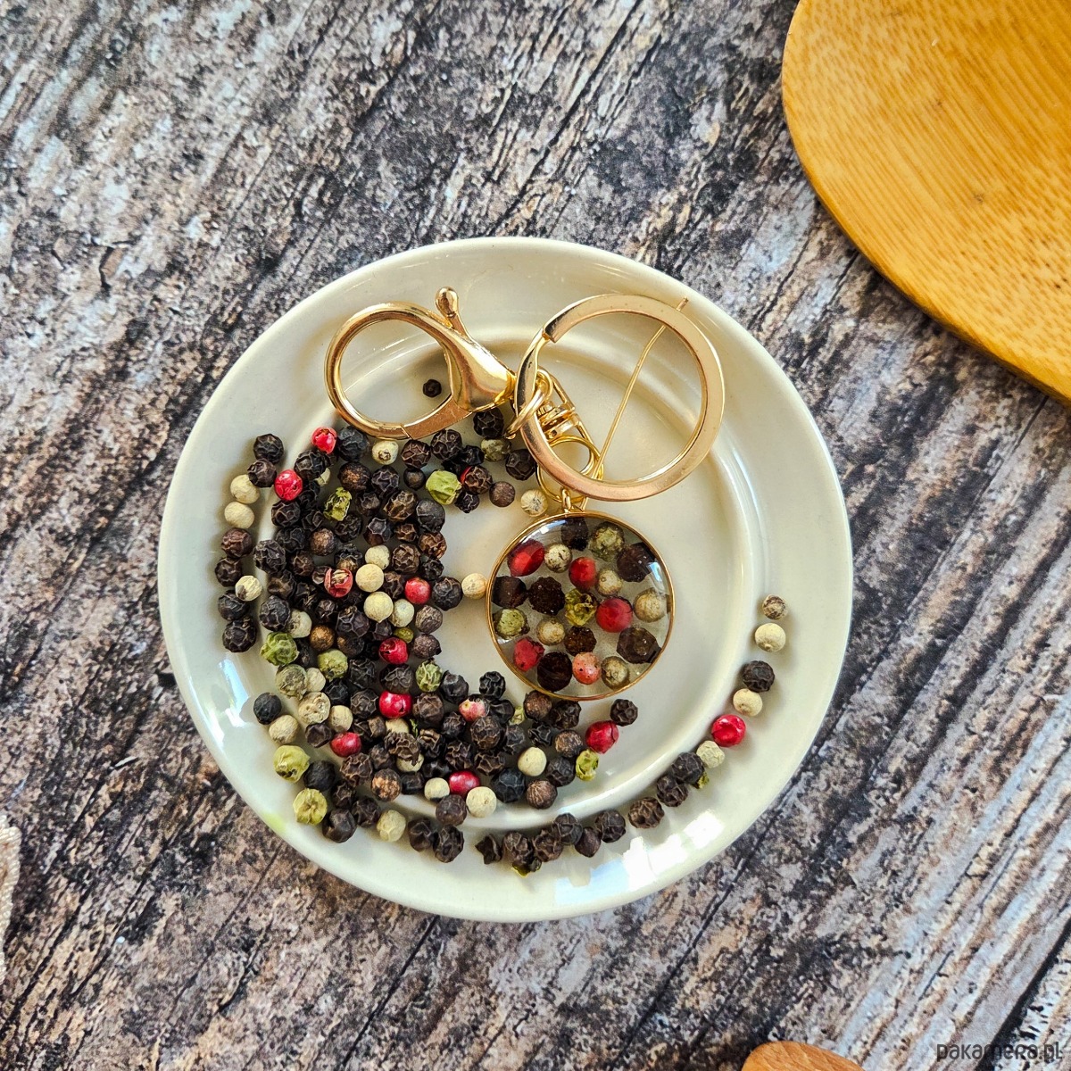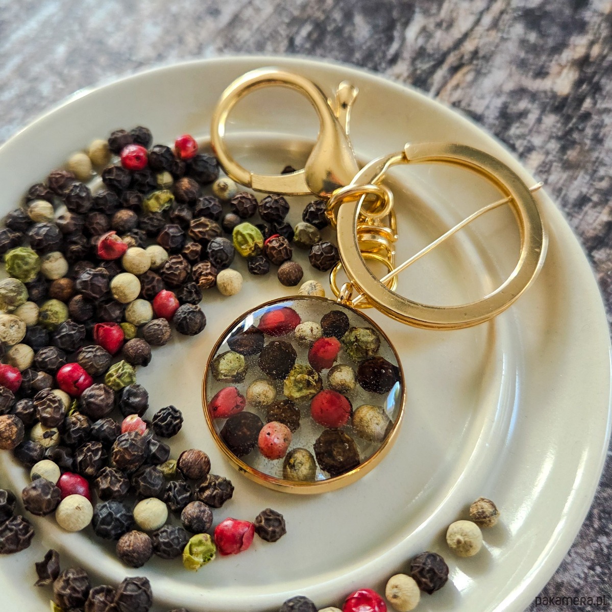 Breloczek z pieprzem zatopionym w żywicy epoksydowej.