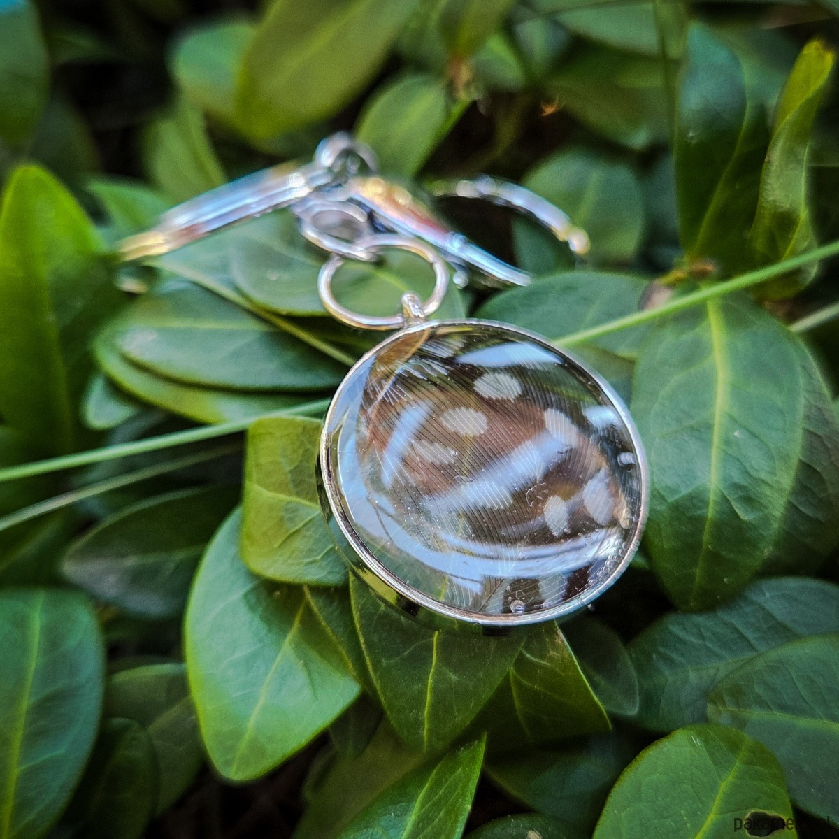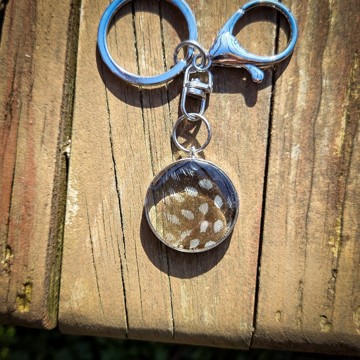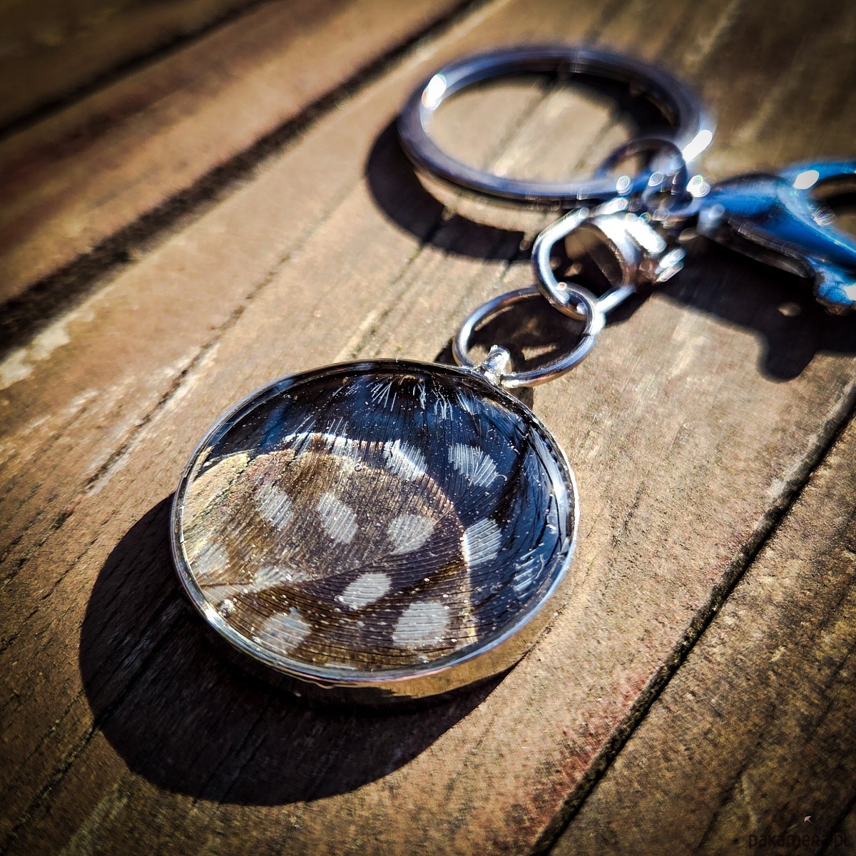 Breloczek z piórkiem zatopionym w żywicy epoksydowej.