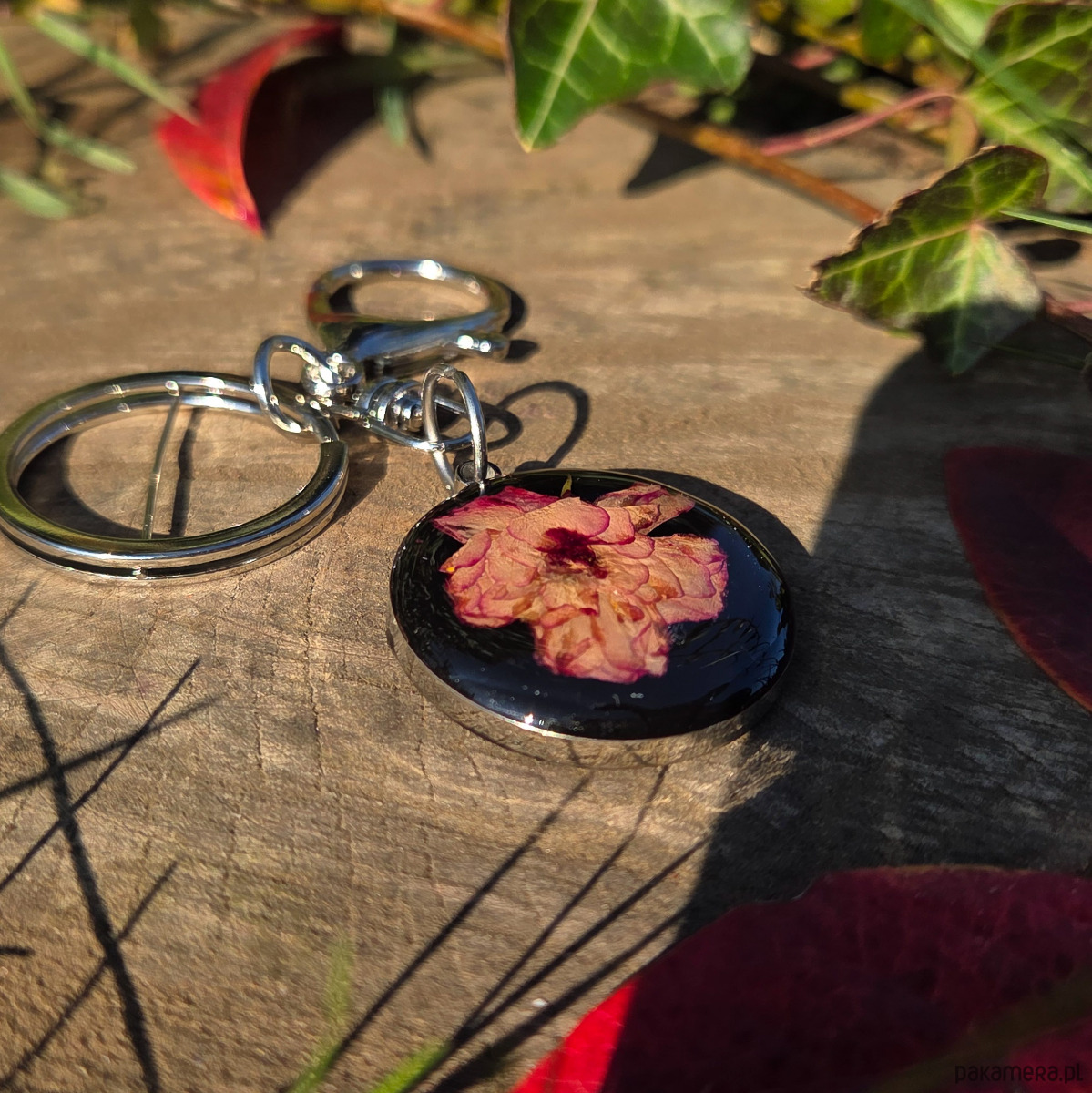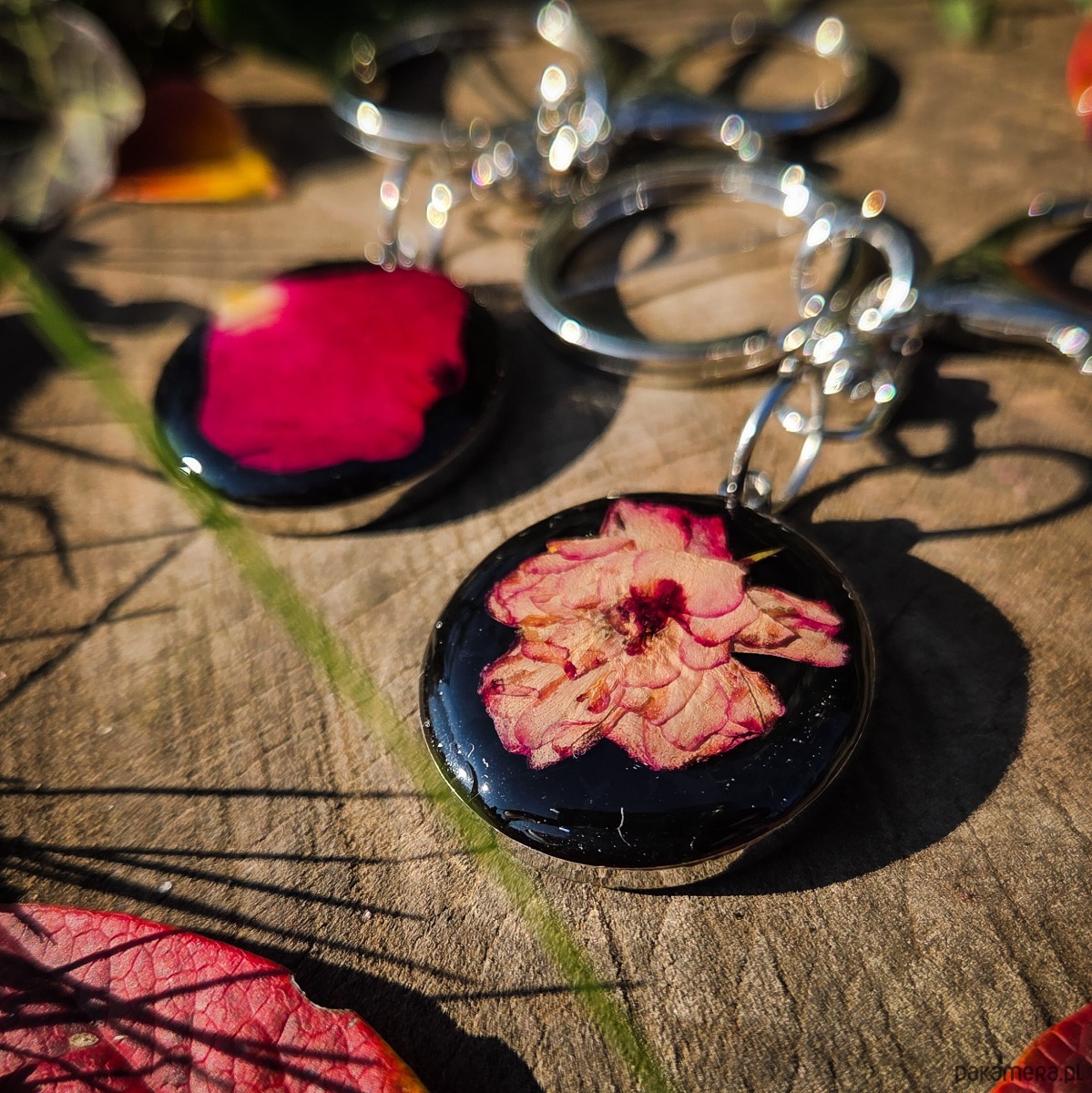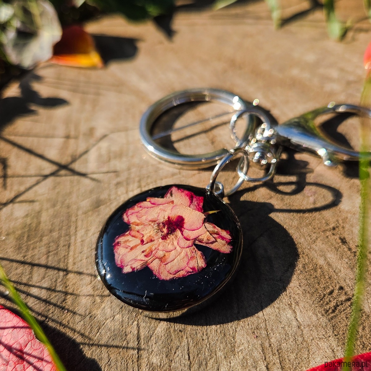 Breloczek z płatkami róży zatopionymi w żywicy epoksydowej.