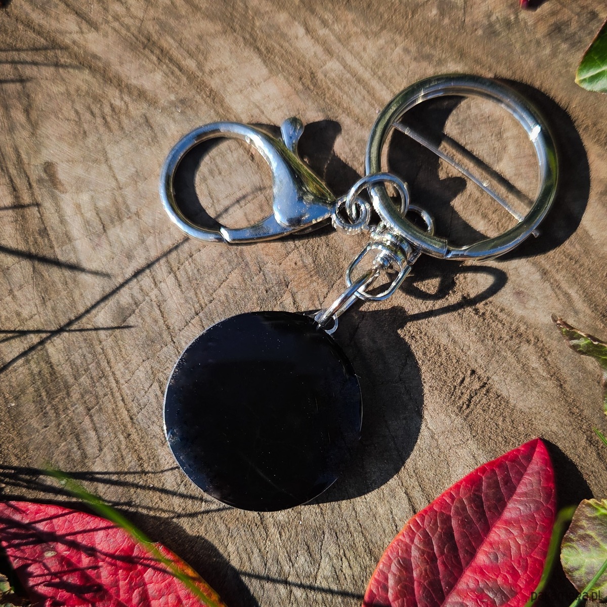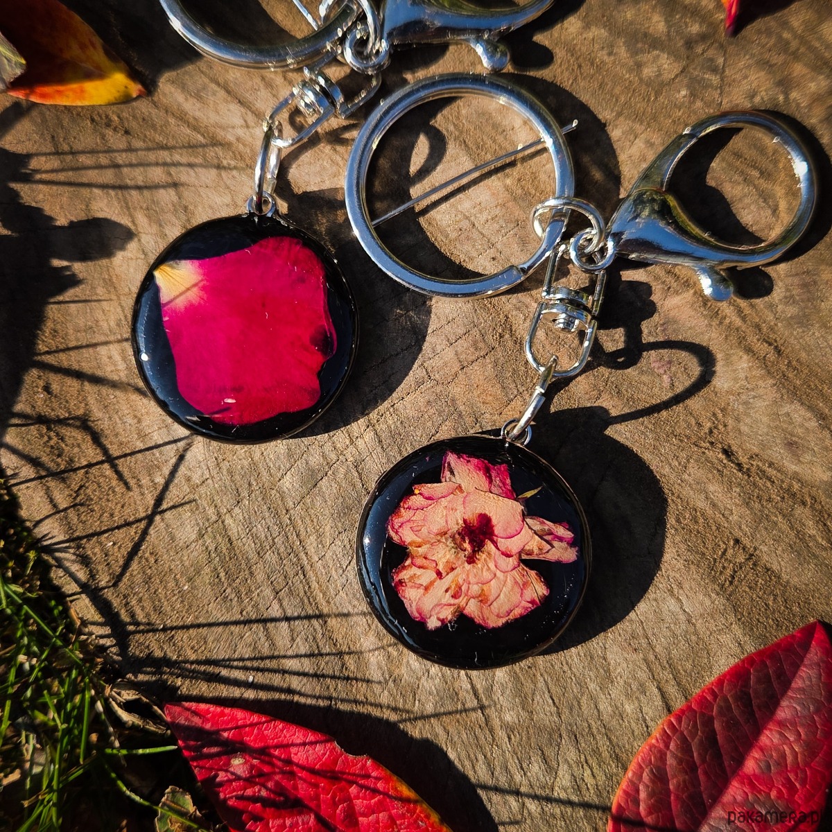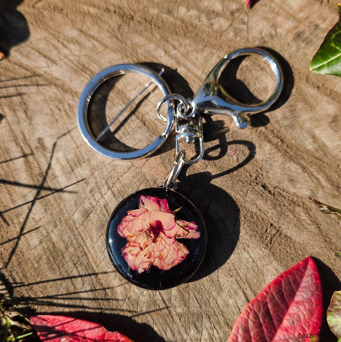 Breloczek z płatkami róży zatopionymi w żywicy epoksydowej.