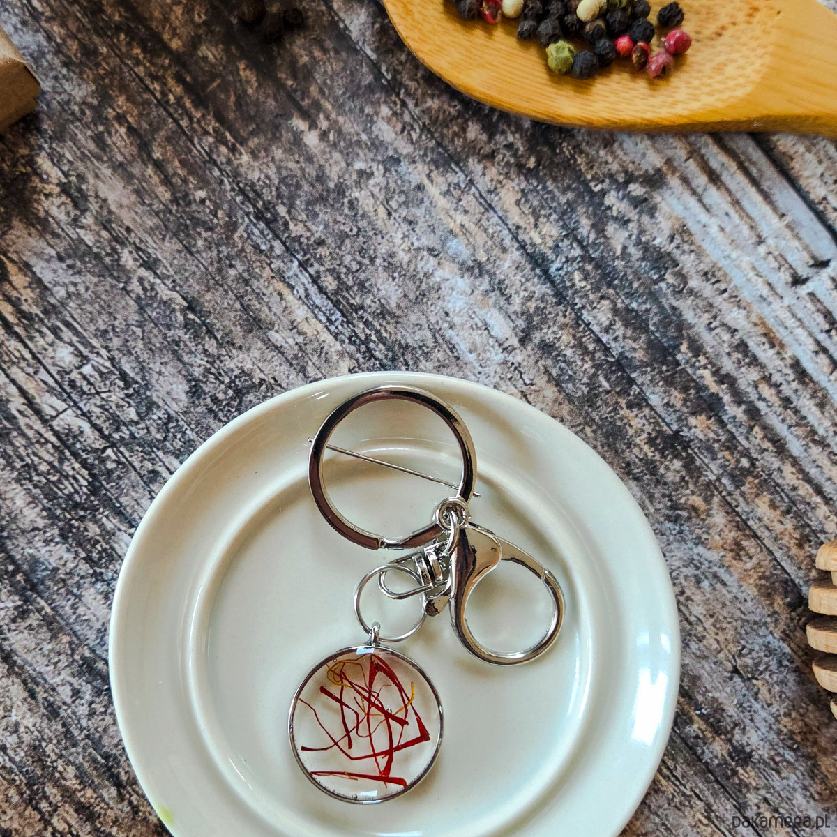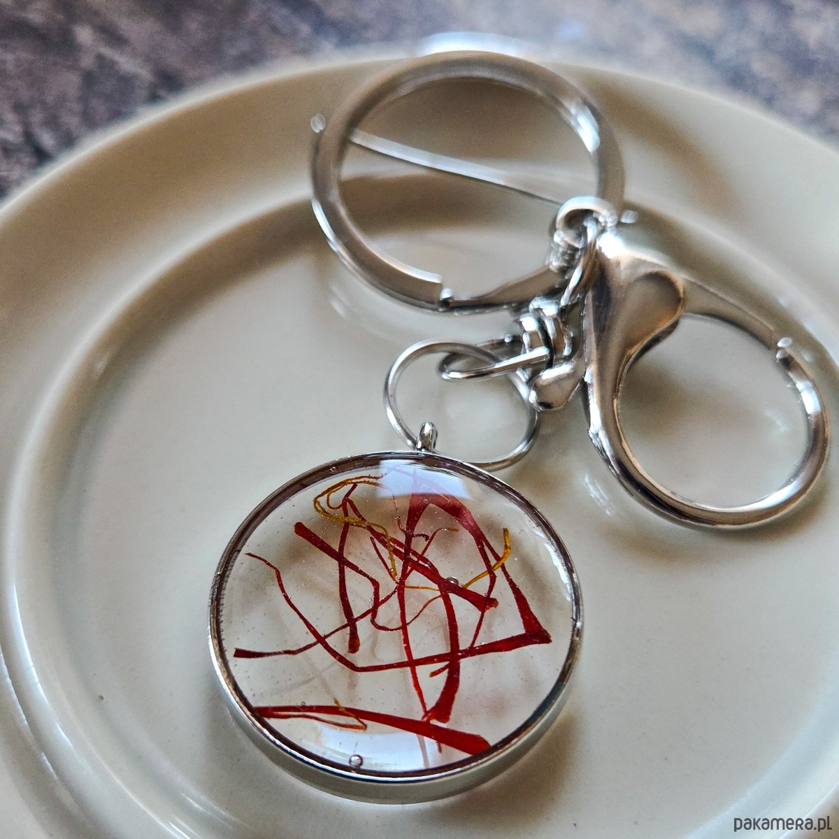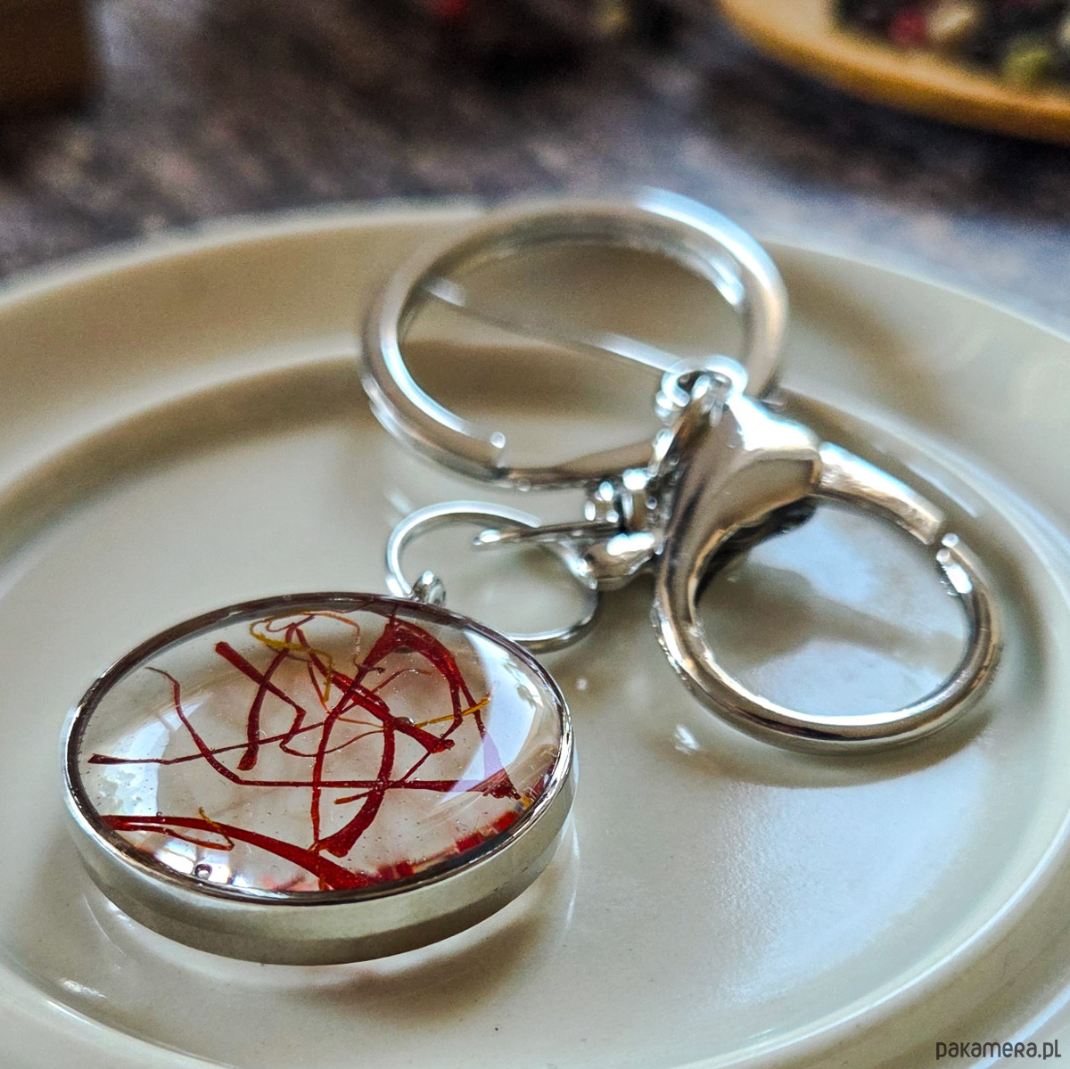 Breloczek z szafranem zatopionym w żywicy epoksydowej.