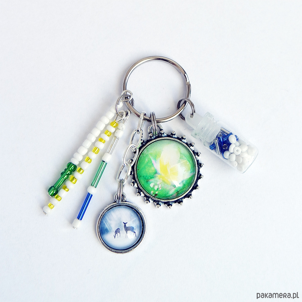 Niezwykły brelok z naszymi autorskimi grafikami, kompozycją z koralików oraz szklaną fiolką.