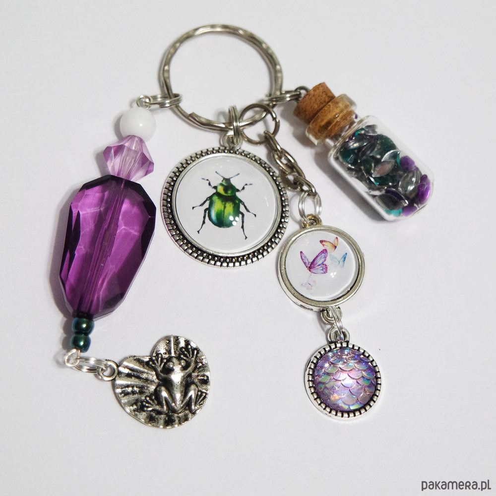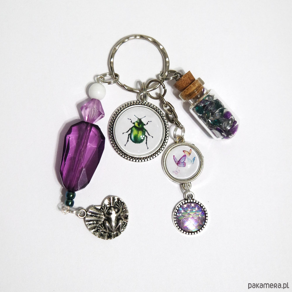Niezwykły brelok z naszymi autorskimi grafikami, kompozycją z koralików, szklaną fiolką oraz zawieszkami.