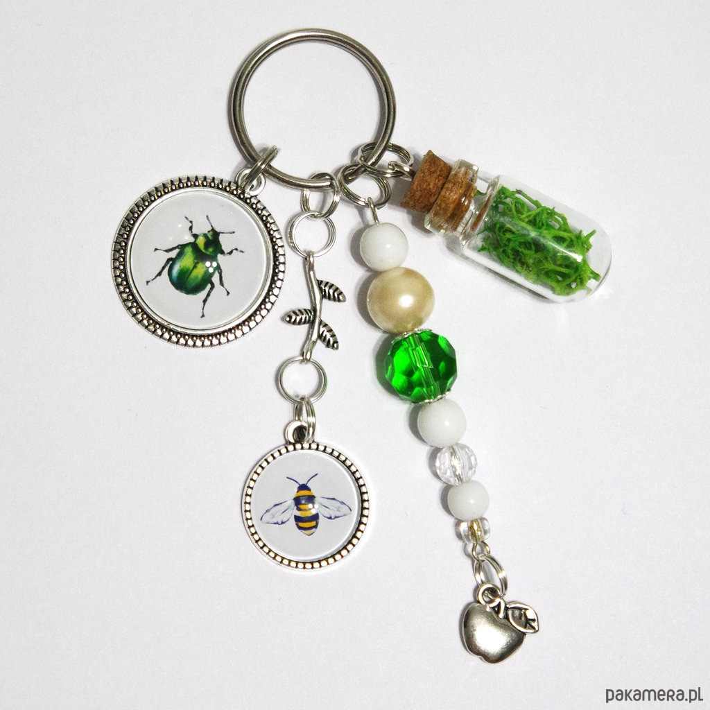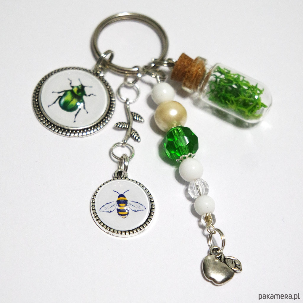 Niezwykły brelok z naszymi autorskimi grafikami, kompozycją z koralików, szklaną fiolką oraz zawieszkami.