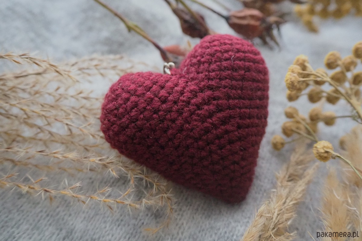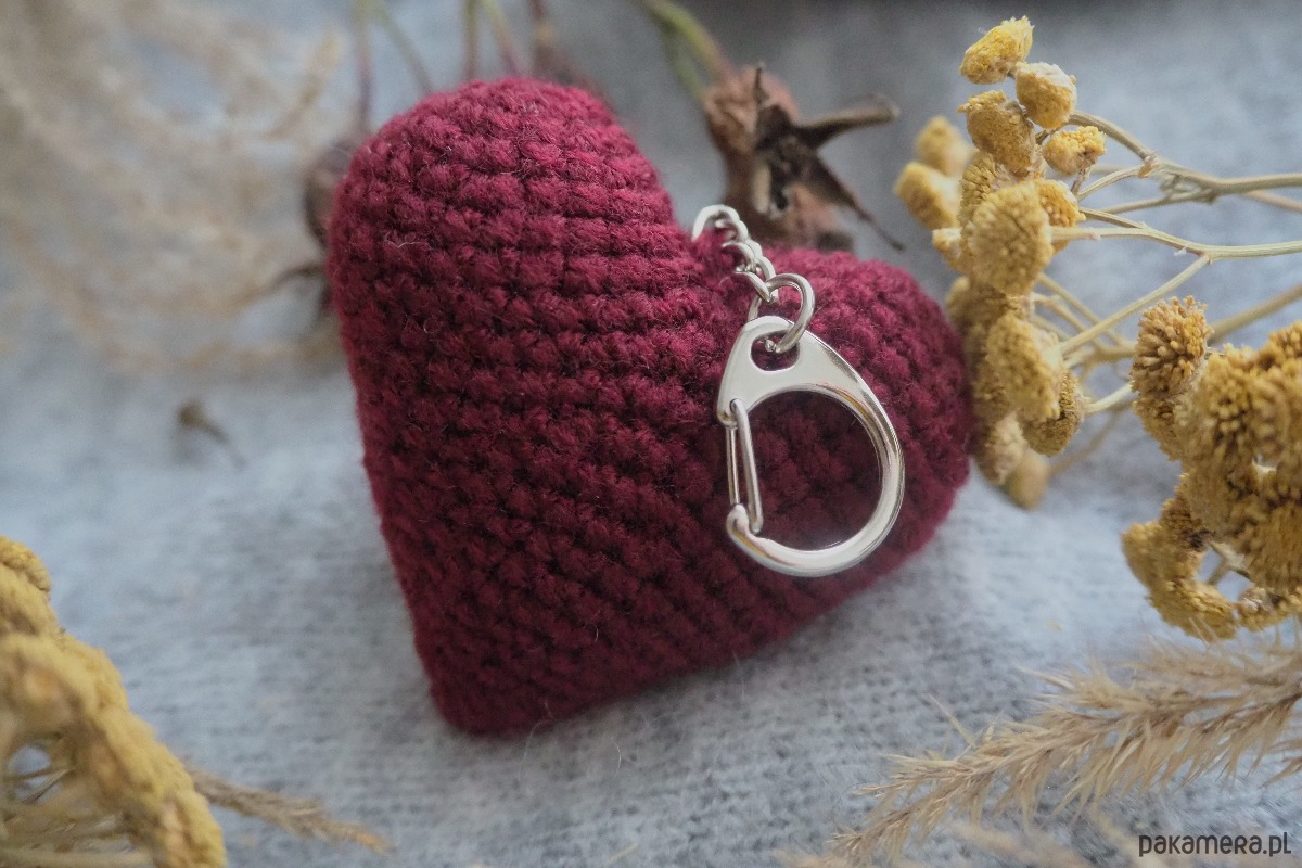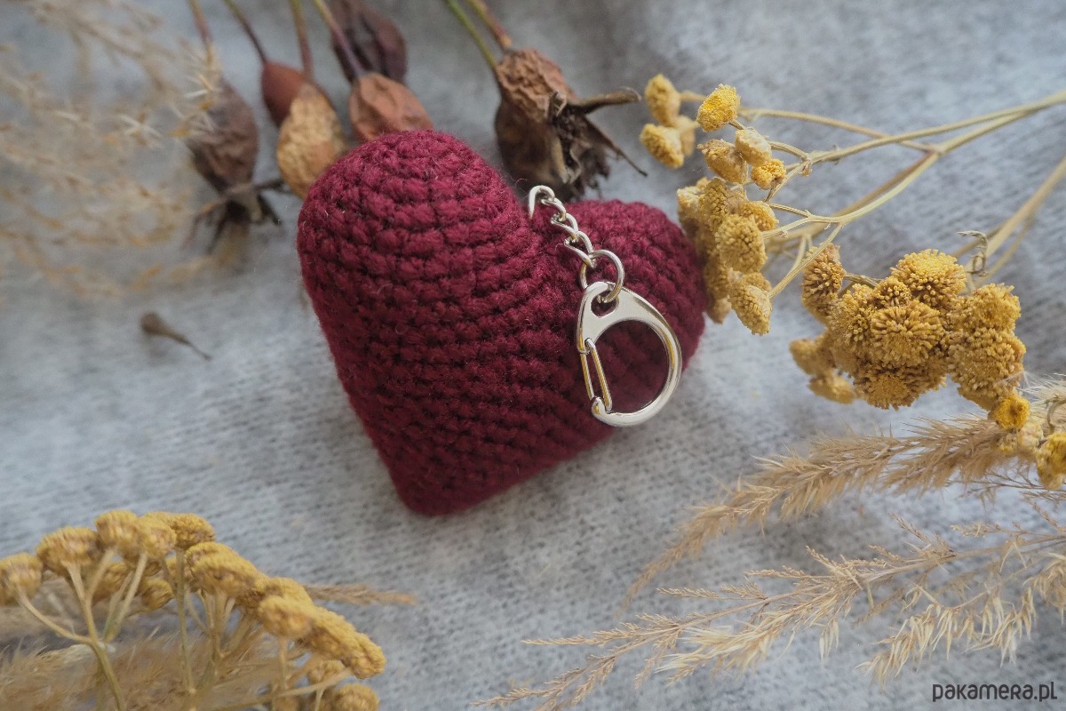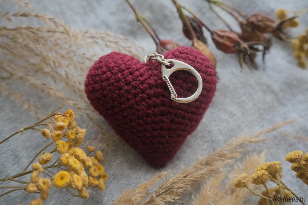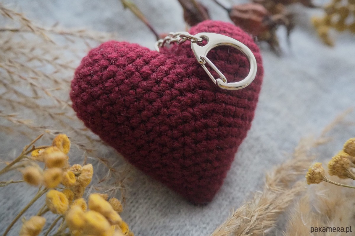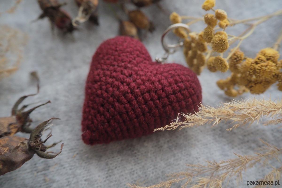 Brelok w kształcie serca wykonany ręcznie z włóczki na szydełku.