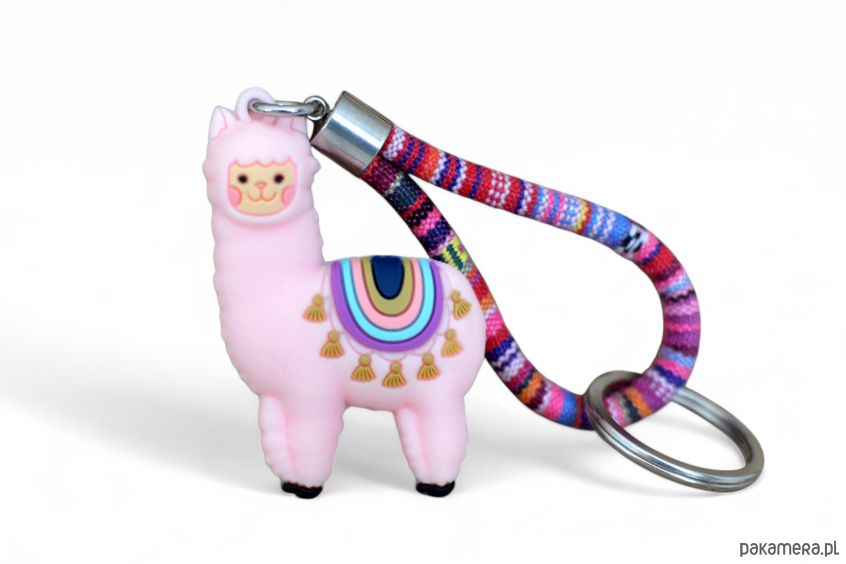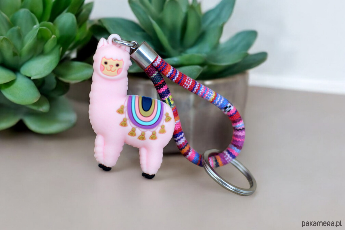 Brelok do kluczy wykonany w stylu boho z szytego rzemienia bawełnianego (śr. 6mm), z tkaniny o wyraźnym splocie. Ozdobę breloka stanowi zabawna, duża, silikonowo-żywiczna zawieszka w kształcie lamy (wym. 4x6cm).