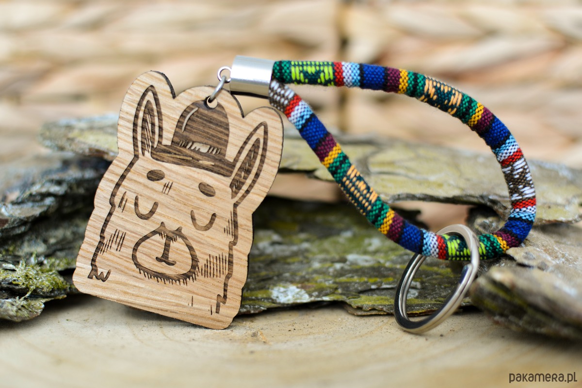 Brelok do kluczy w stylu boho wykonany z szytego rzemienia materiałowego/bawełnianej liny materiałowej o średnicy 6mm (z tkaniny o wyraźnym splocie) oraz elementów ze stali szlachetnej i drewna. Ozdobę breloka stanowi urocza drewniana zawieszka w kształcie głowy lamy w kapeluszu (wysokość 6cm, szerokość 4,2cm, grubość drewna 0,5cm). Zawieszka została wycięta laserowo z litego drewna dębowego (NIE ZE SKLEJKI!).
