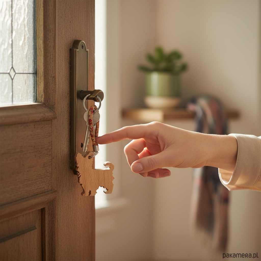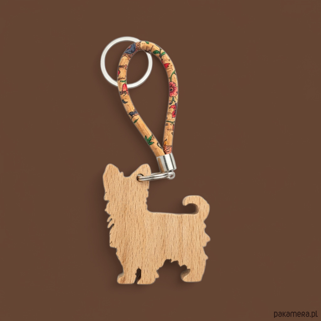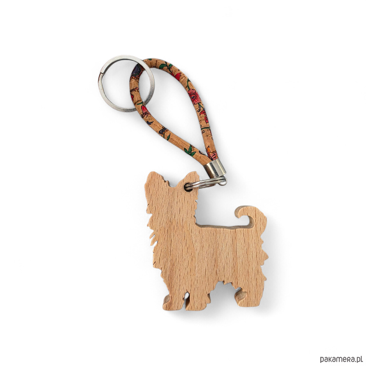 Brelok do kluczy wykonany jest z okrągłego, zdobionego portugalskiego korka (o śr 0,5cm) oraz drewnianej zawieszki w kształcie psa rasy york (wysokość pieska: 6cm, szerokość: 5,5cm, grubość drewna ok. 1cm). Ozdoba breloka została wycięta ręcznie z litego drewna bukowego i jest dwukrotnie pokryta warstwą lakieru wodnego. Do umocowania kluczy służy okrągłe, solidne kółko o średnicy ok. 3cm. Wszystkie elementy metalowe użyte do wykonania breloka to antyalergiczna, wytrzymała i nie zmieniająca z upływem czasu swej barwy stal szlachetna.