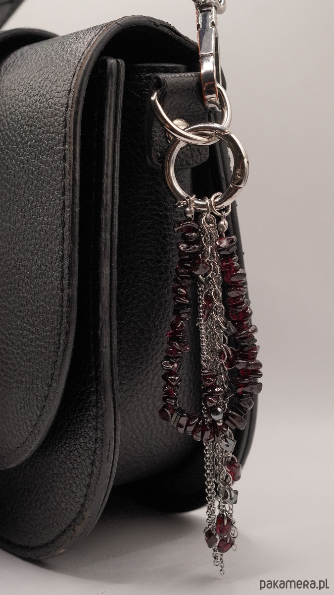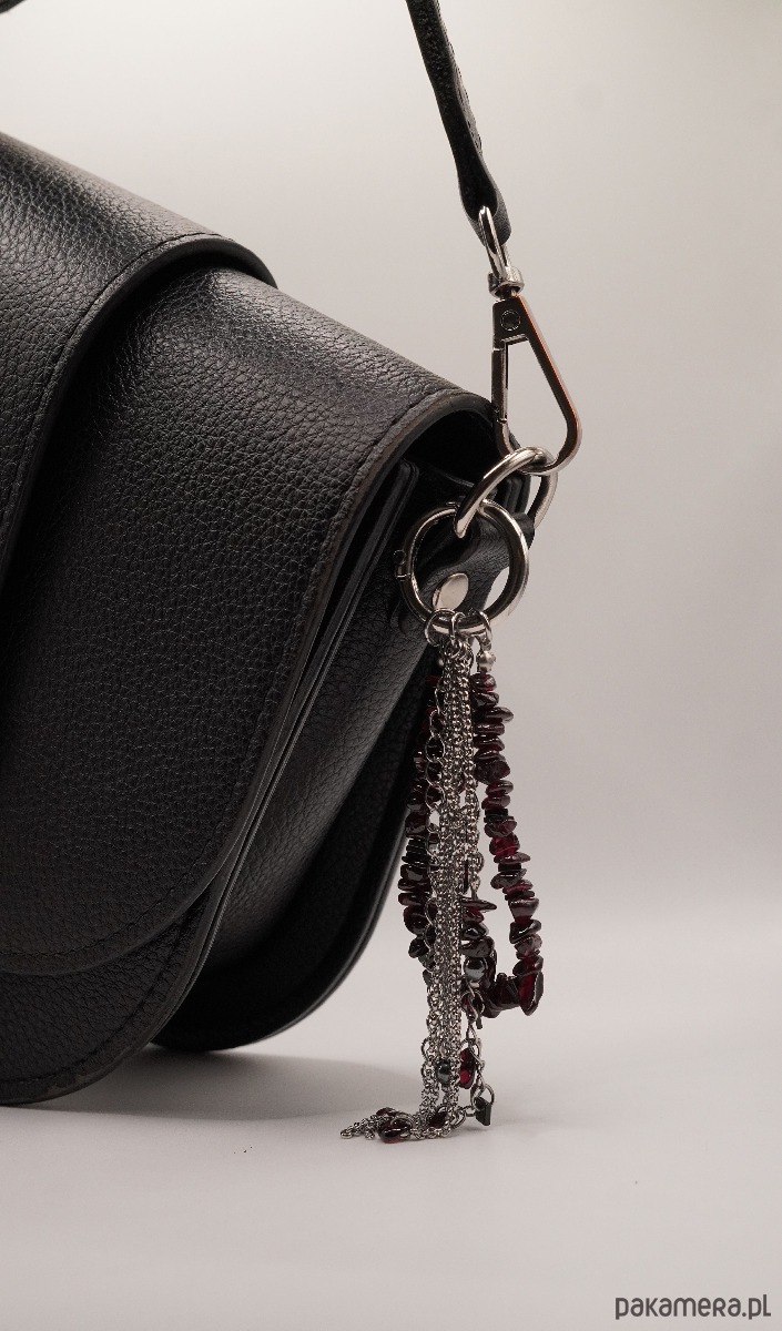 Energia kamienia: Naturalny granat w formie surowej kruszki zachowuje swoją naturalną moc i głębię koloru. Głęboki, winny odcień doskonale podkreśla fakturę skóry Twojej torebki.
