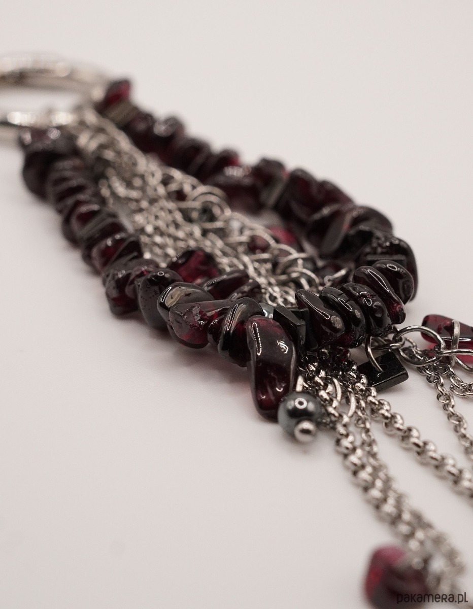 Gra faktur: Wstawki z hematytu oraz kaskadowe, delikatne łańcuszki dodają ozdobie wielowymiarowości. Brelok nie tylko wisi — on „żyje” w ruchu.