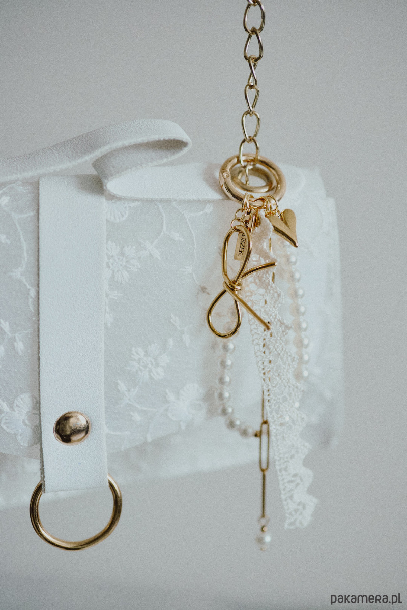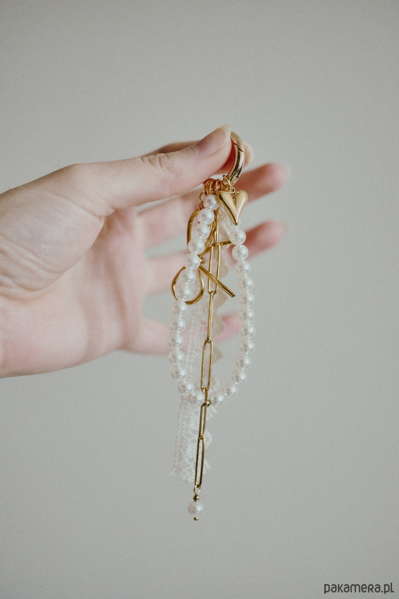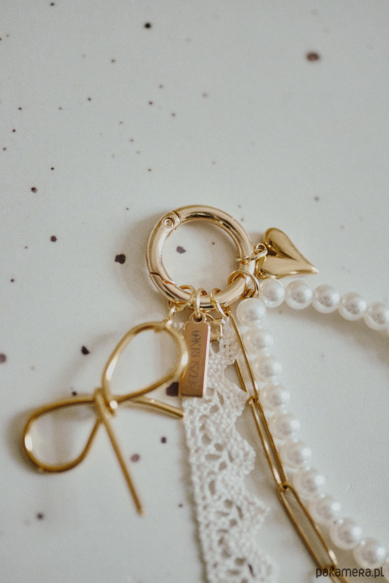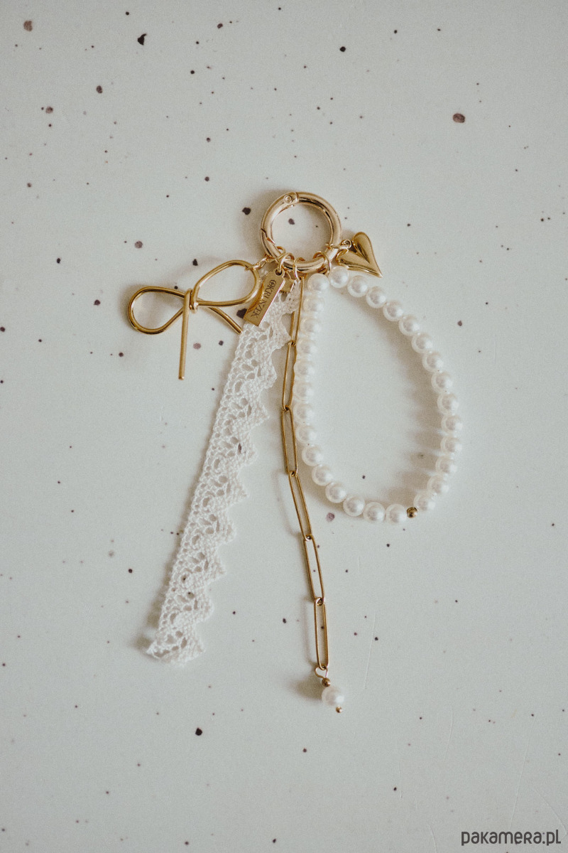 Bita Śmietana składa się z: zawieszki kokardy, zawieszki z sercem, bawełnianej wstążki, łańcuszka, szklanych pereł, logo marki.