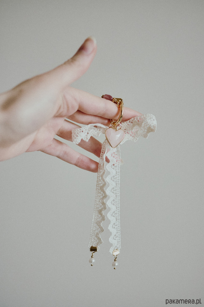 Rubi składa się z: dużego serca z naturalnego kwarcu różowego, bawełnianej kokardy, kwarcu truskawkowego, szklanych pereł, logo marki.