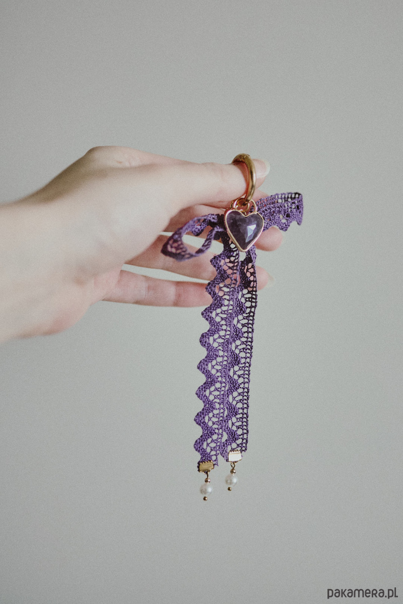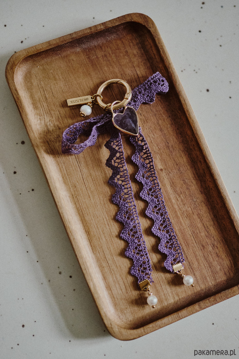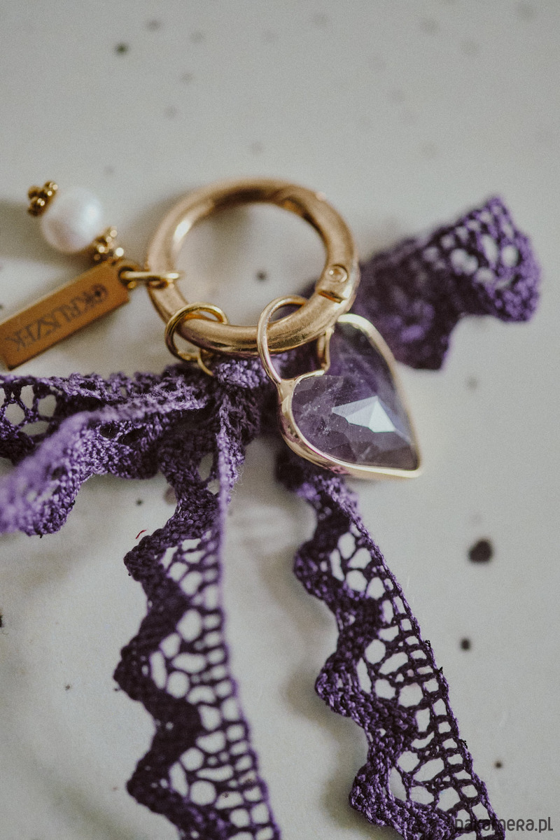 Vajoletto składa się z: dużego serca z naturalnego ametystu, bawełnianej kokardy, naturalnej perły, szklanych pereł, logo marki.