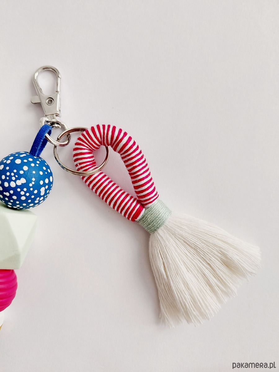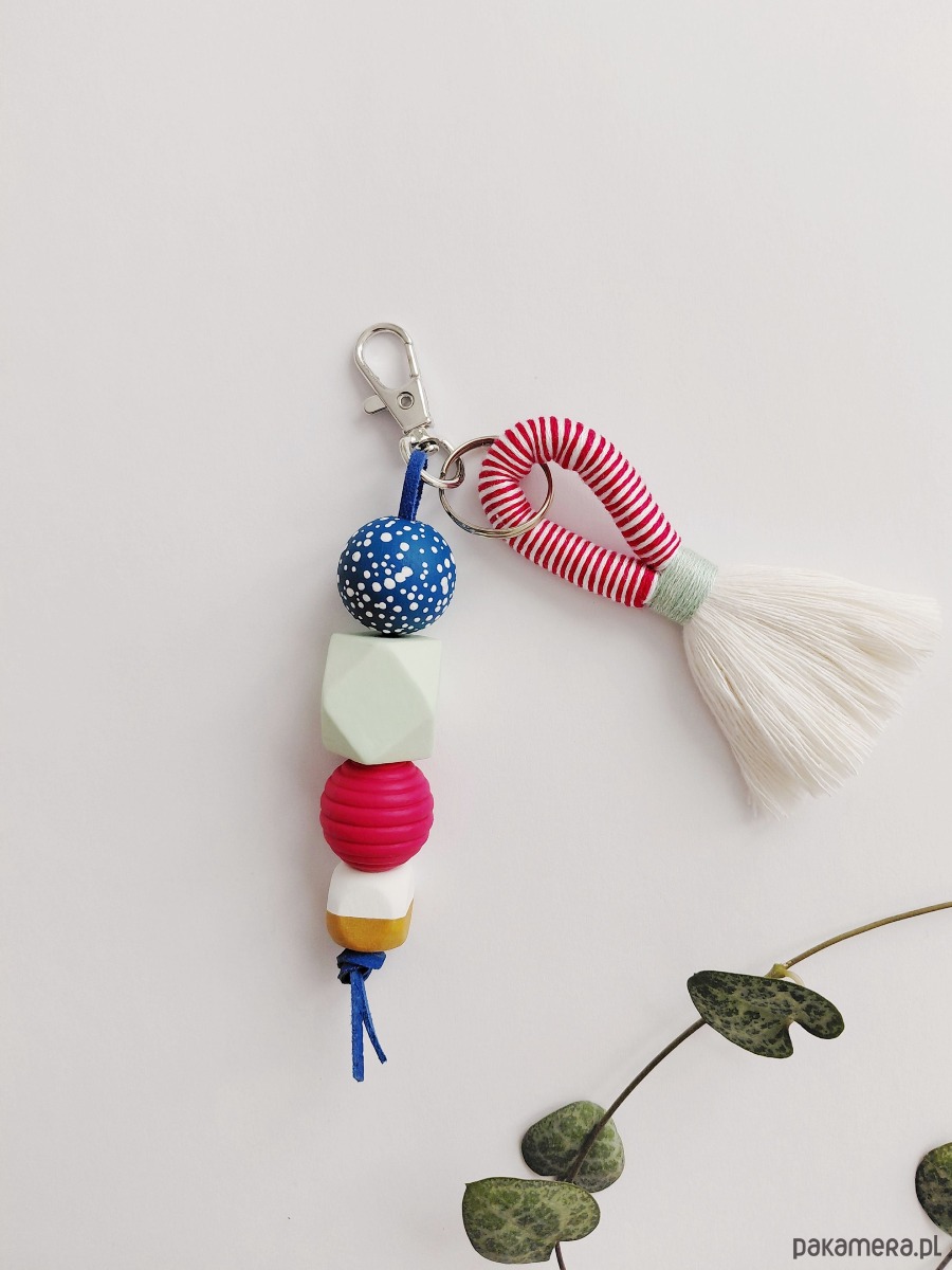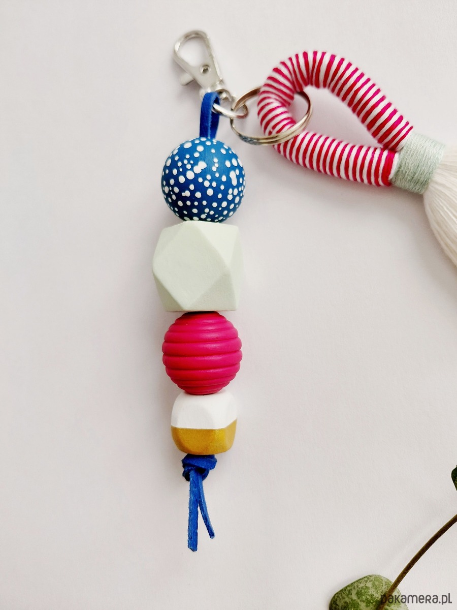 Brelok wykonany z elementów drewnianych malowanych i zabezpieczonych lakierem.