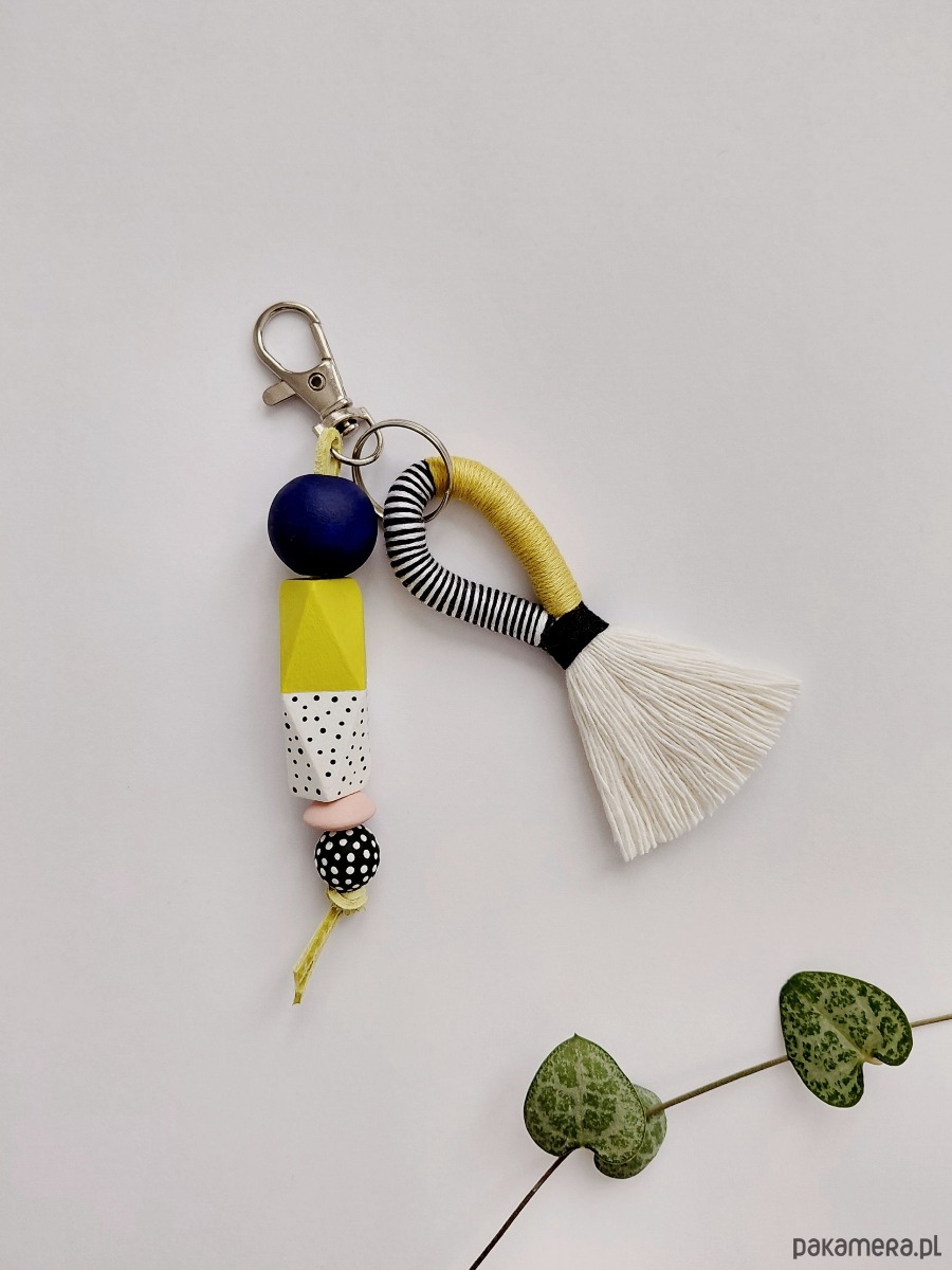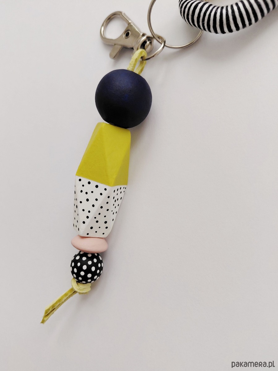 Brelok wykonany z elementów drewnianych malowanych i zabezpieczonych lakierem.
