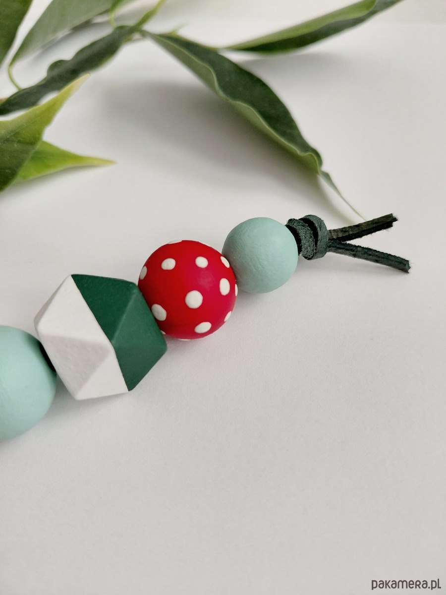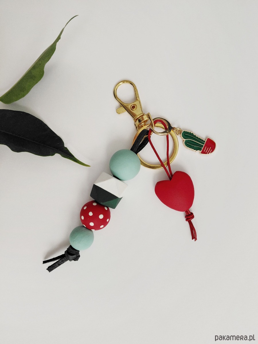 Brelok wykonany z elementów drewnianych malowanych i zabezpieczonych lakierem.