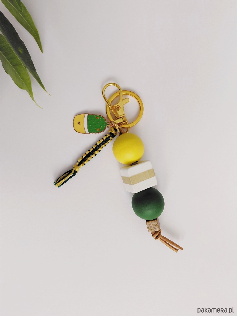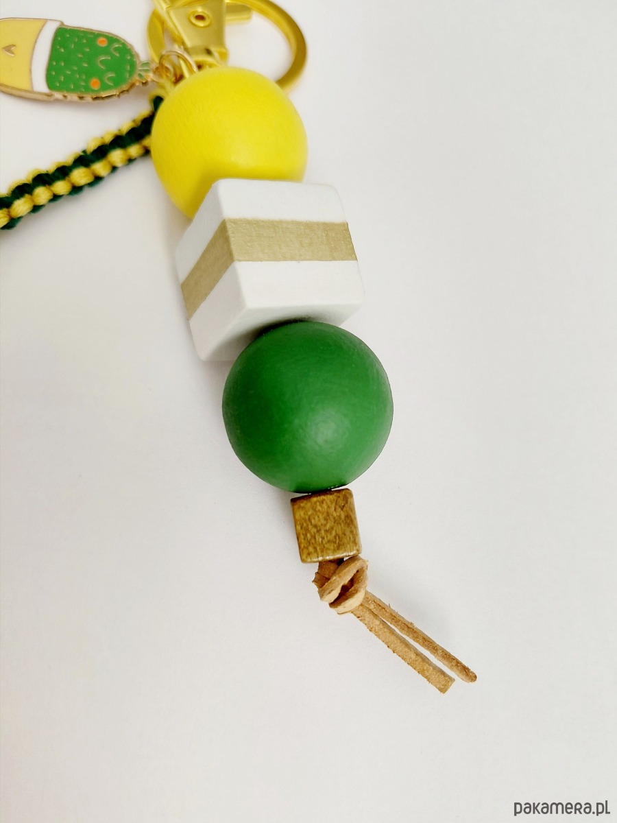 Brelok wykonany z elementów drewnianych malowanych i zabezpieczonych lakierem.