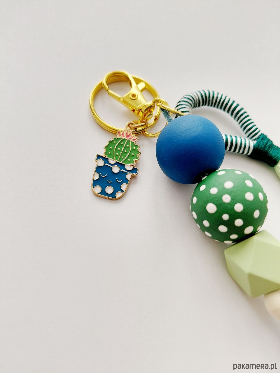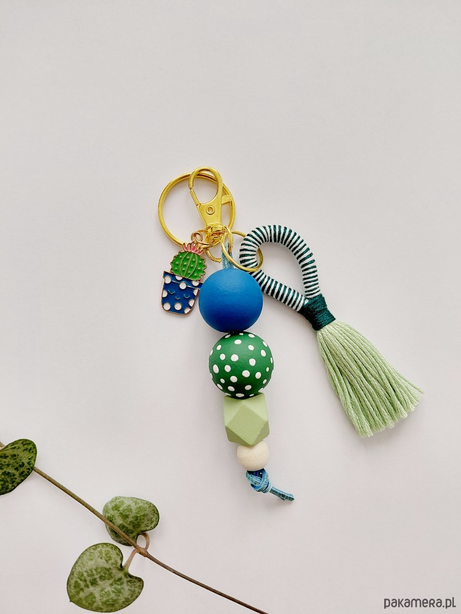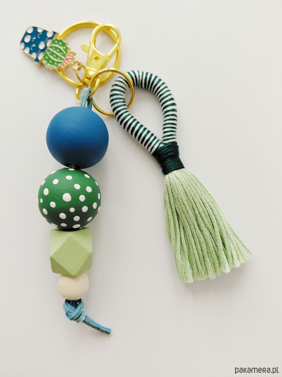 Brelok wykonany z elementów drewnianych malowanych i zabezpieczonych lakierem.