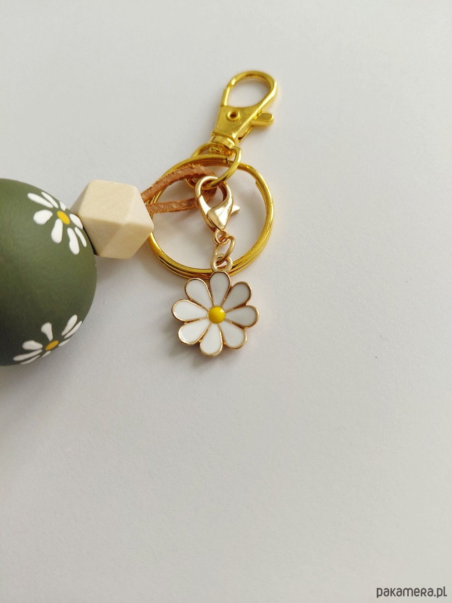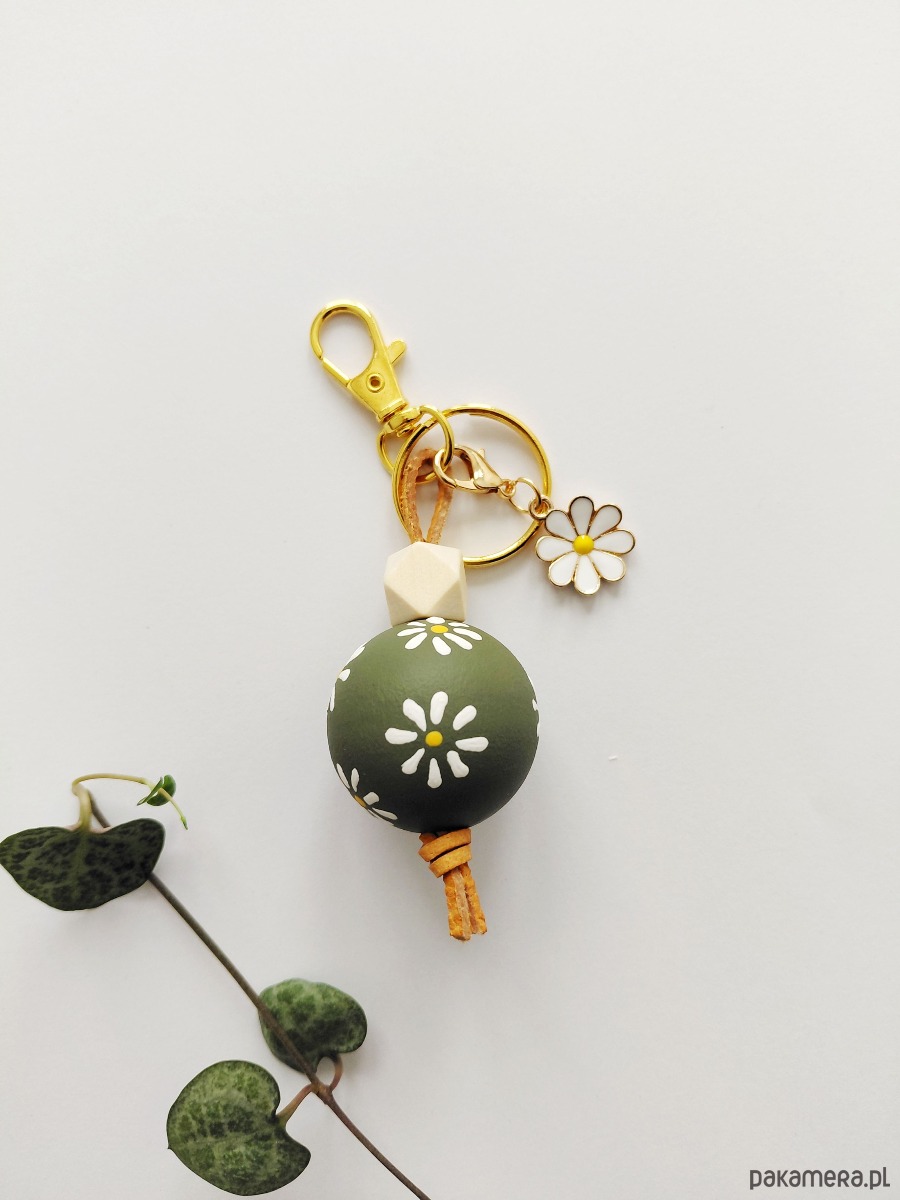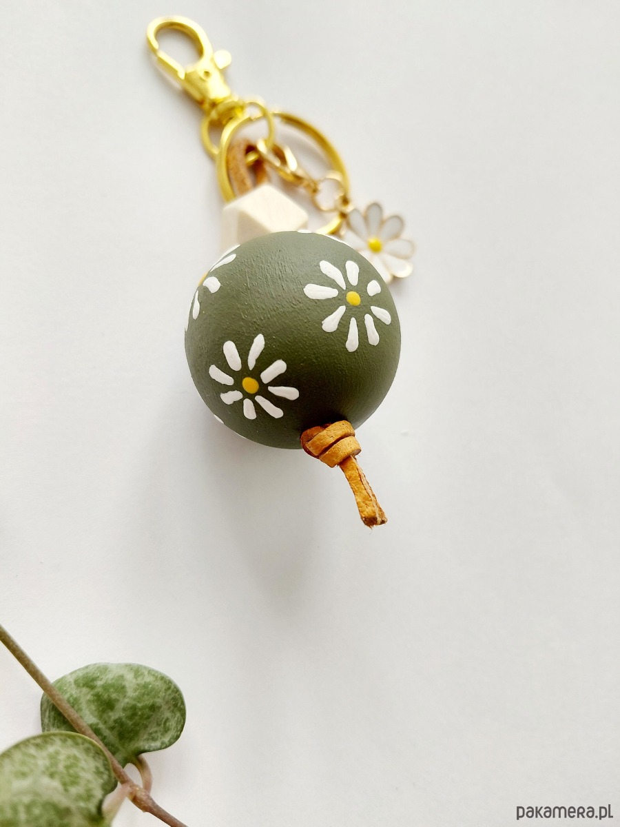 Brelok wykonany z elementów drewnianych malowanych i zabezpieczonych lakierem.