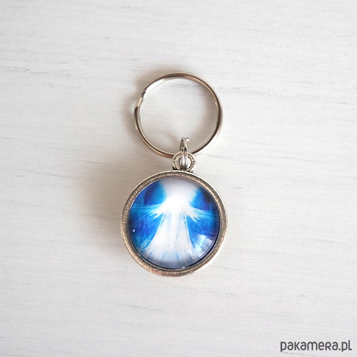 Grafiki ukryte w dwustronnym breloczku, pod osłoną przeźroczystego półokrągłego szkiełka.