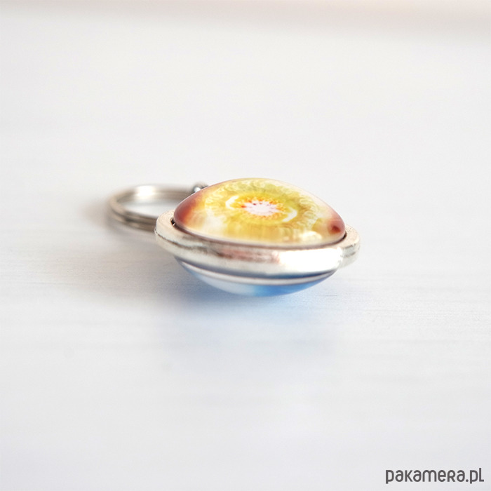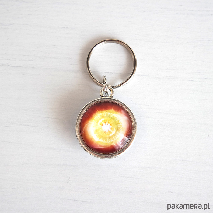 Grafiki ukryte w dwustronnym breloczku, pod osłoną przeźroczystego półokrągłego szkiełka.