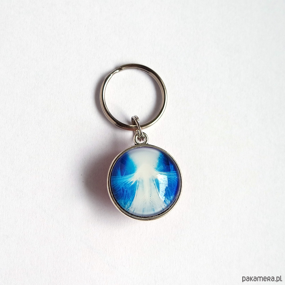 Grafiki ukryte w dwustronnym breloczku, pod osłoną przeźroczystego półokrągłego szkiełka.