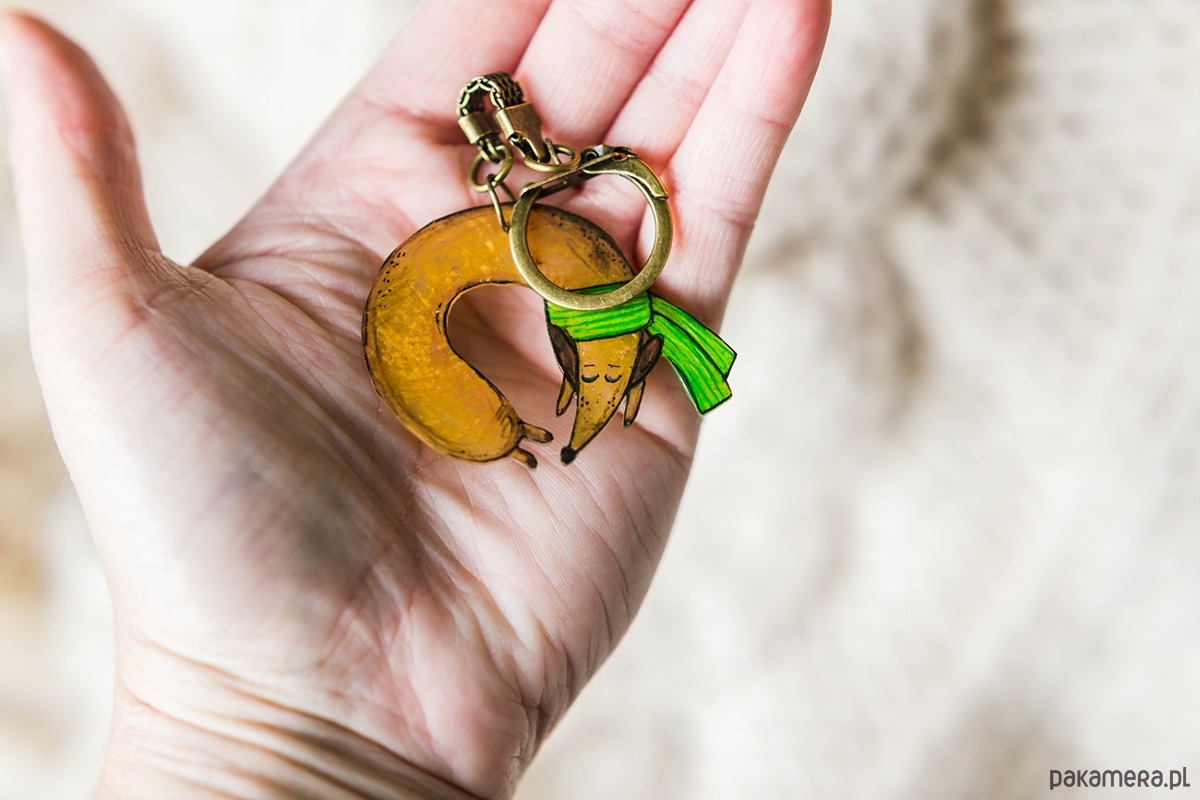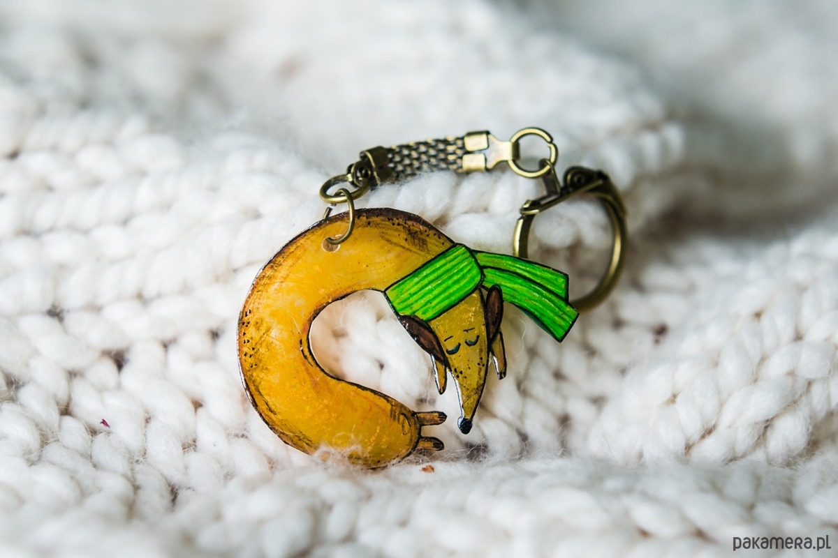 Brelok ręcznie narysowany, kredkami akwarelowymi na termokurczliwej folii, zabezpieczony lakierem ekologicznym.