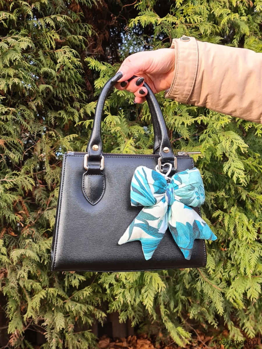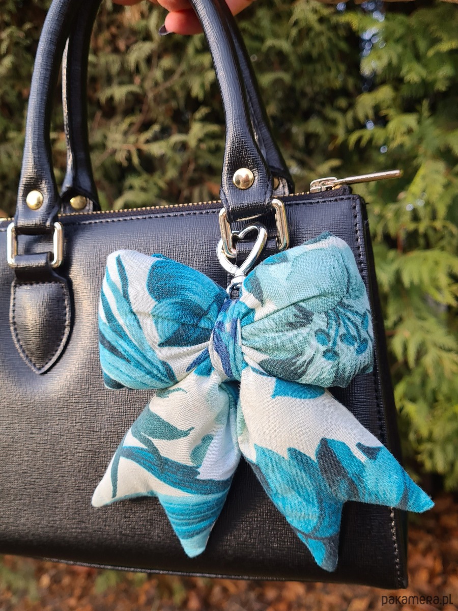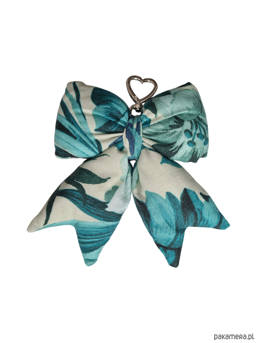 Uroczy brelok w kształcie kokardy, uszyty ręcznie z materiałów z drugiego obiegu. Wypełniony jest ścinkami z owaty, która normalnie wylądowałaby już na śmietniku, ale my dałyśmy im kolejną szansę w pięknym wydaniu. Dzięki karabińczykowi może służyć jako stylowa ozdoba torebki lub praktyczna zawieszka do kluczy. Każdy egzemplarz jest niepowtarzalny.