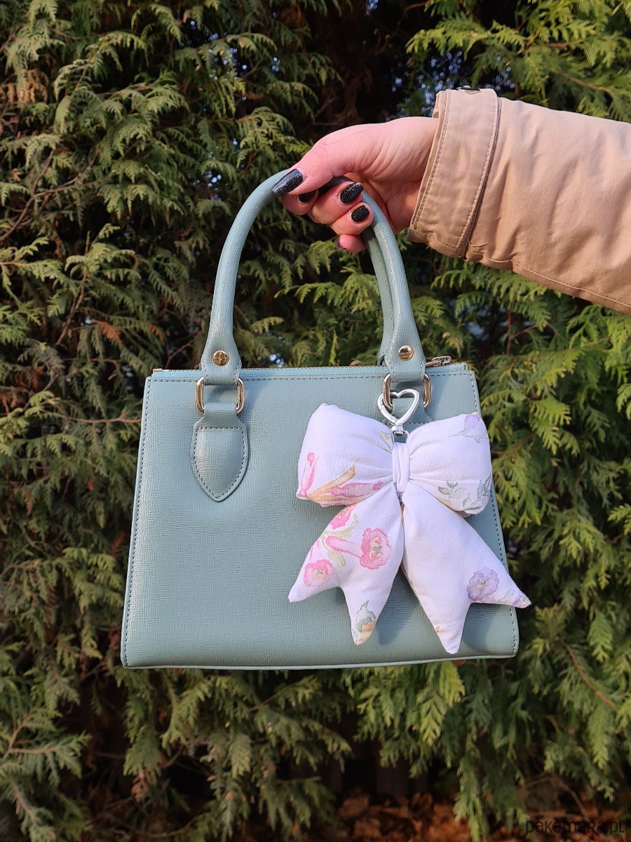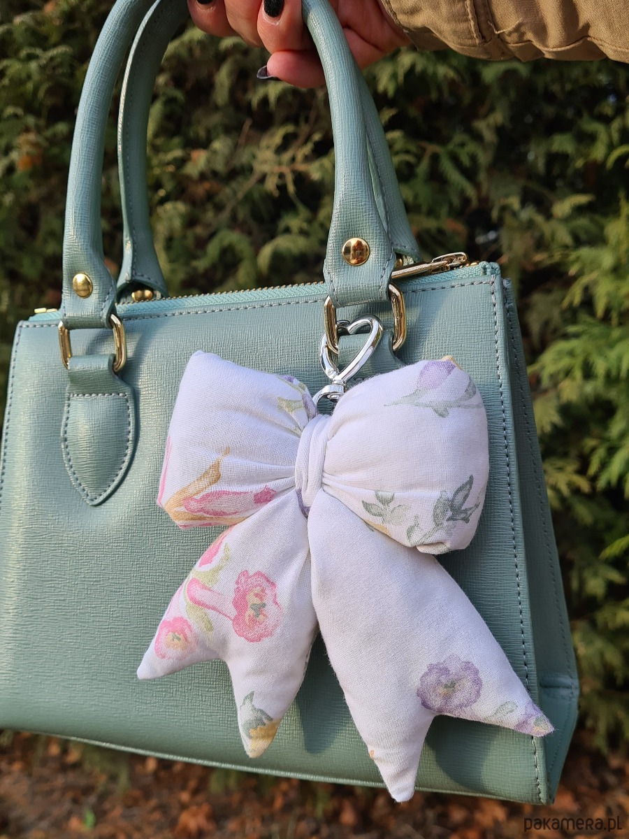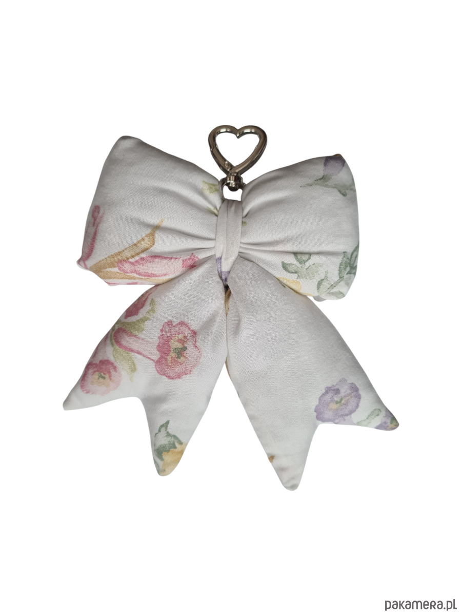 Uroczy brelok w kształcie kokardy, uszyty ręcznie z materiałów z drugiego obiegu. Wypełniony jest ścinkami z owaty, która normalnie wylądowałaby już na śmietniku, ale my dałyśmy im kolejną szansę w pięknym wydaniu. Dzięki karabińczykowi może służyć jako stylowa ozdoba torebki lub praktyczna zawieszka do kluczy. Każdy egzemplarz jest niepowtarzalny.